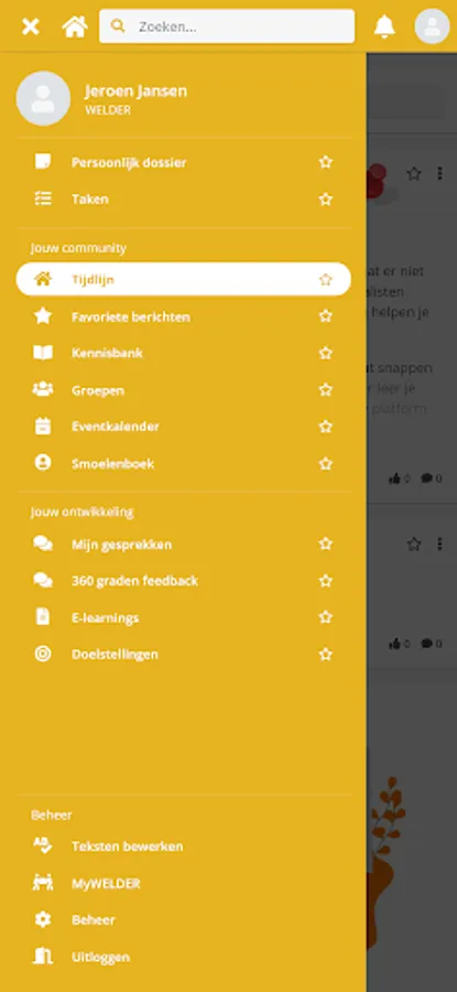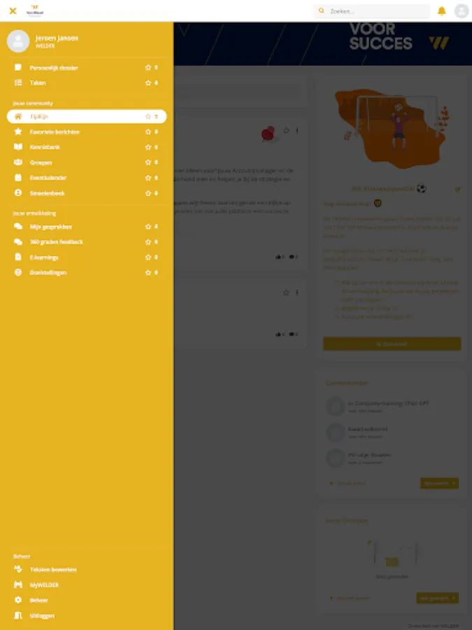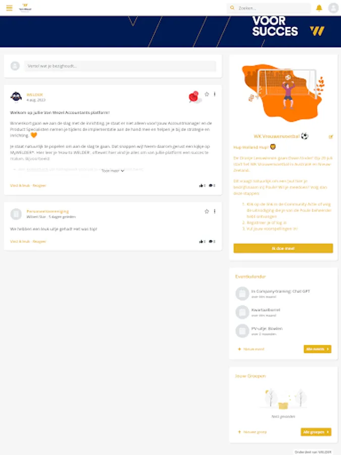 The Van Wezel app; the online platform for you to easily and quickly share new knowledge, ideas and successes with your colleagues. Thanks to useful features such as a timeline, event calendar, groups and special community promotions, you are informed in real time about everything that is happening at your employer. Thanks to push notifications, you are reminded of responses from your colleagues, but also of tasks you have to do. Consider preparing your performance review or following up on agreements made for your development plan. All aspects of an innovative progress discussion are discussed; your competencies, ambitions, training and objectives. Working on your personal goals is easily integrated into your daily work. All new colleagues receive a digital induction program via the app, while departing employees receive an exit analysis. And there is a fun knowledge quiz or product training regularly.