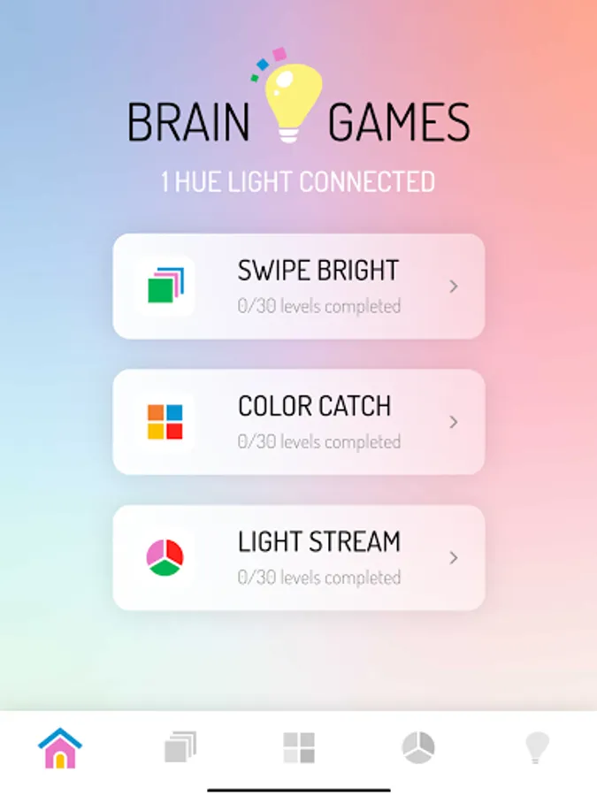 For the ultimate light-controlled brain training experience, it is required to have a Philips Hue bridge and at least one color light connected to this bridge. Note that the game can also be played without any lights, although it is less fun of course. It is not possible to connect dimmable on/off lights with the app, since all games are based on color.