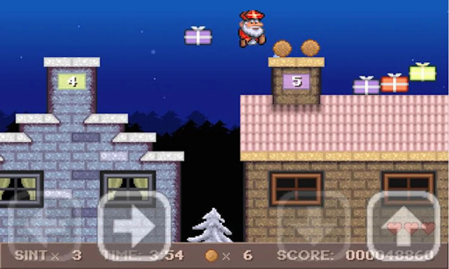 Story: Sint has been robbed! The thieves have taken his big sack full of presents and gingerbread cookies. In their run, however, the they aren't careful and everything start dropping out of the sack. Now Sint only has to collect the lost cookies and presents and bring them to the right chimney.