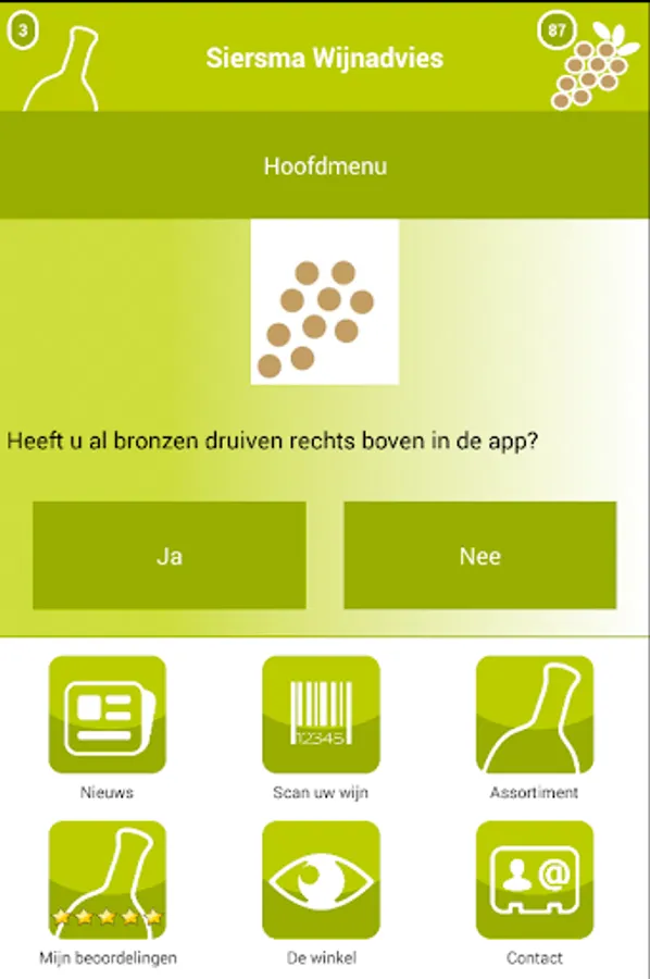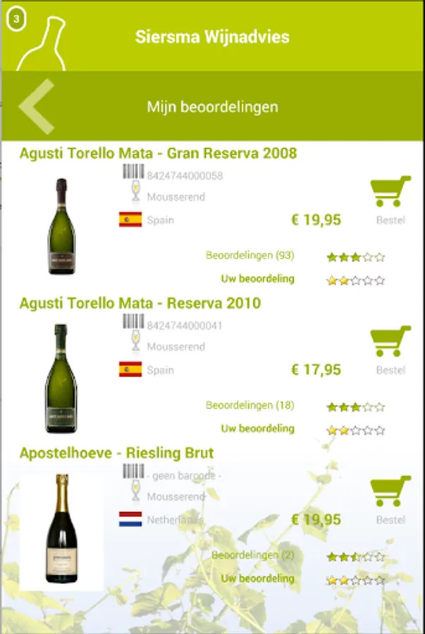 Recommended wine with the Siersma App gives you your appreciation of the fine wines of Sierma Wine advice. You can see the appreciation of other connoisseurs and orders quickly and easily your favorite wine. In addition, you have at home and in the shop directly to view all your prized wines! Add your appreciation is simple: you scan the barcode of your wine, indicates the number of stars and you're done!