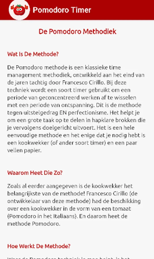 Waar de Pomodoro techniek je mee helpt, is het effectiever gebruiken van je tijd. Je zult vast wel eens het gevoel hebben gehad dat je niets hebt onthouden van de lesstof, terwijl je al uren aan het leren bent. Gek toch? Het komt waarschijnlijk door alle afleidingen om je heen. Francesco Cirillo zette daarom die beroemde tomaten-kookwekker op 25 minuten. In die 25 minuten beloofde hij zichzelf volop te concentreren op één taak. Daarna nam hij 5 minuten pauze, waarna hij de kookwekker opnieuw op 25 minuten zette. Één zo een 25-minuten sessie noemde hij een 'Pomodoro'. Nadat hij vier Pomodoro's had voltooid, gaf hij zichzelf een langere pauze van ongeveer 20 minuten. Dit ritme is de basis van de Pomodoro techniek.