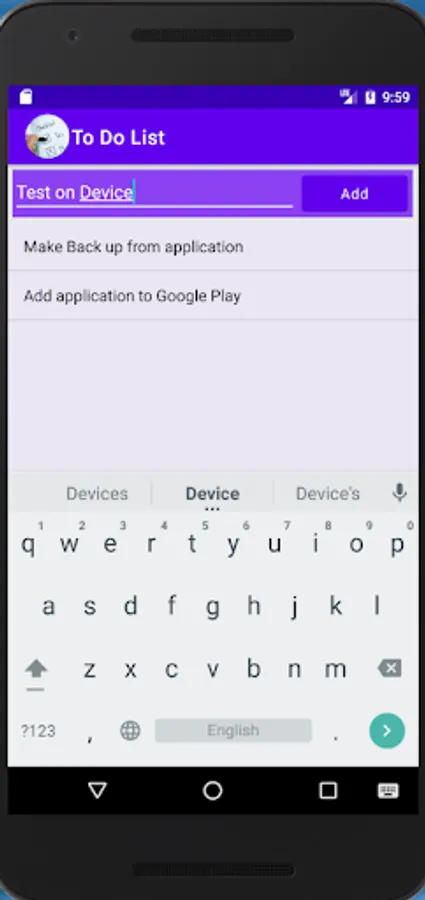 A simply To Do List application for your mobile phone. All the tasks ar stored only on your mobile. You can add as many tasks as you want. Also you can delete tasks that are done. No priority, no reports, no planning. Just quick registration of a task.