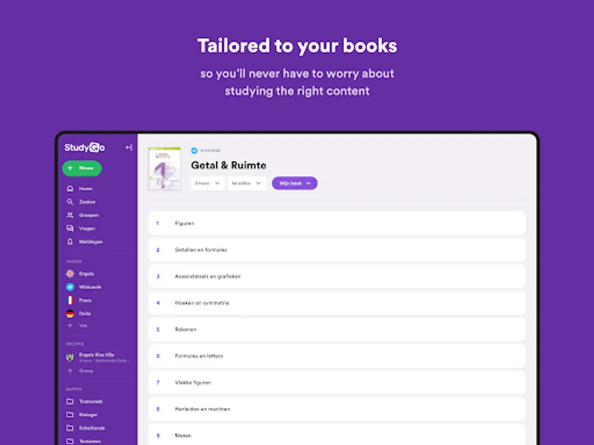 StudyGo features well-known teaching methods such as Stepping Stones, Geometry, De Geo, and many more. By adding your books, you can be sure you are practising the right material. On the book page, you will find everything: extra practice questions that are not in your book, summaries, glossaries, and explanation videos.