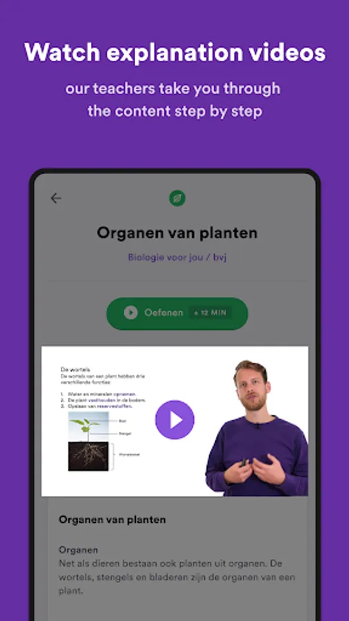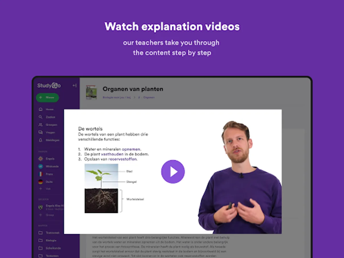 • Watch explainer videos from our teachers (more than 7,500 explainer videos made by teachers like Math With Menno, Meneer Wietsma, Biologie met Joost, and others. These videos are exclusive to StudyGo)
