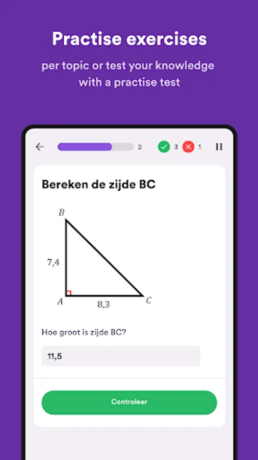 On StudyGo, you can practise topics for different subjects separately. For each subject, you choose which material you want to test. For example, search for the Pythagorean theorem or photosynthesis and start practising. For each question, you get step-by-step instructions on how to find the right answer.