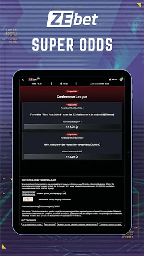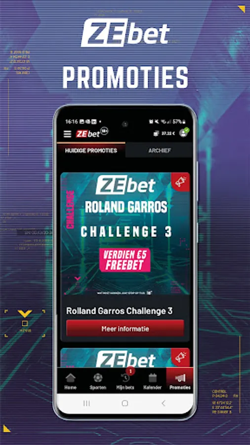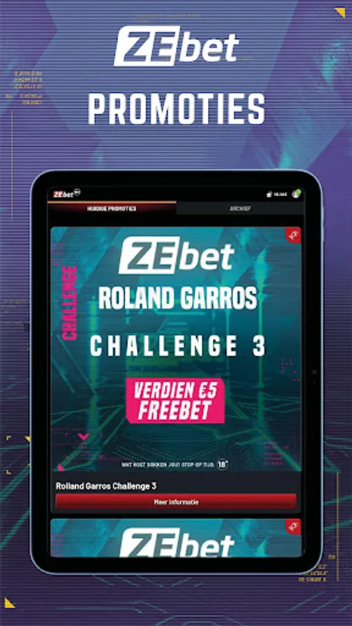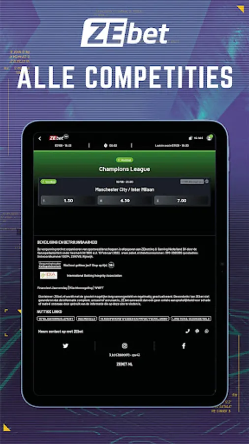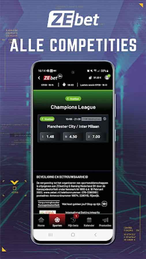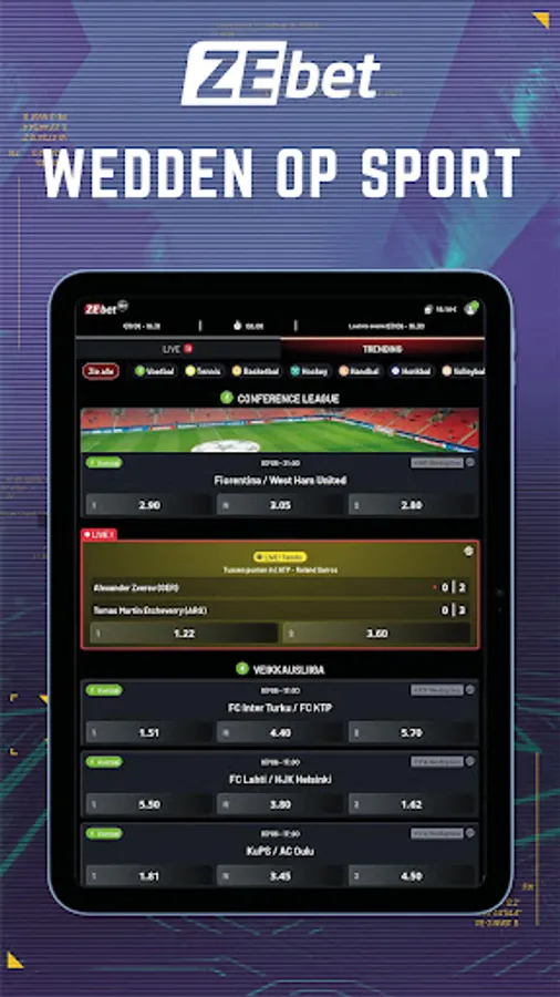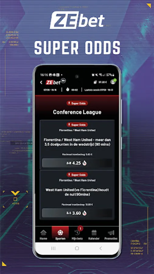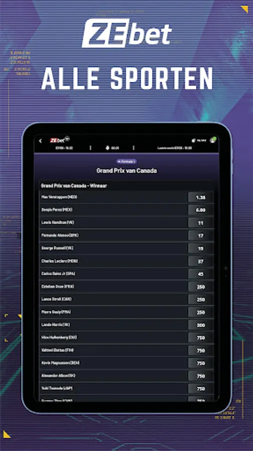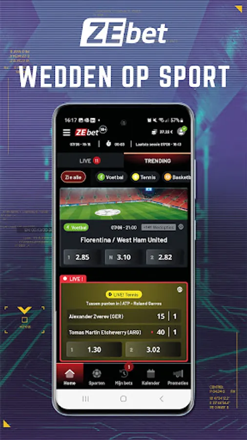 The ZEbet App focuses entirely on sports betting. Bet on thousands of football matches such as the Eredivisie, Premier League, Champions League, World Cups and European Championships and so on. But also bet on many other sports such as tennis, F1, darts, NBA, NFL, NHL, MLB, cycling, etc.