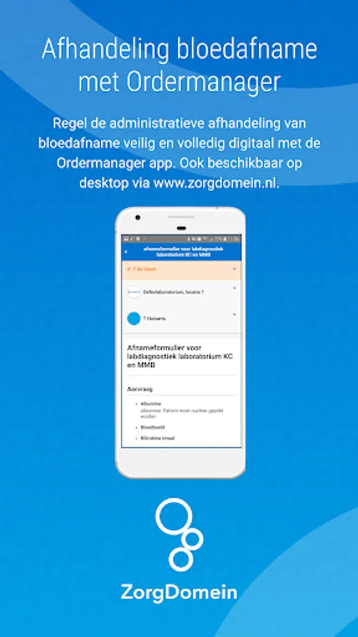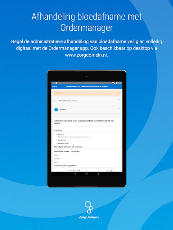Ordermanager is part of the ZorgDomein platform with which healthcare providers can safely consult, refer and request diagnostics. See www.zorgdomein.com for more information.