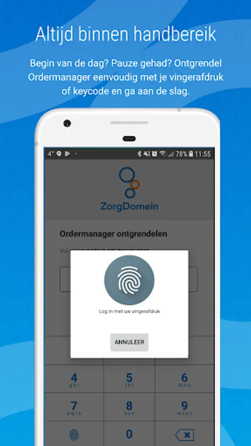 - If you do not use the app for a while, it will be locked automatically. With your fingerprint or keycode you get quick access and you can get started again.