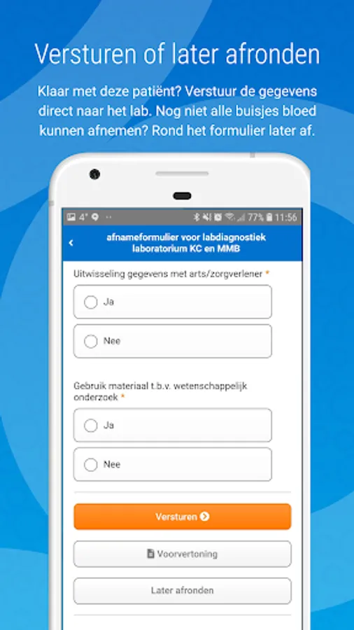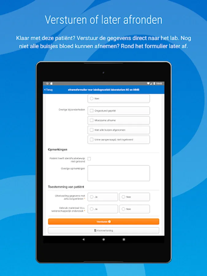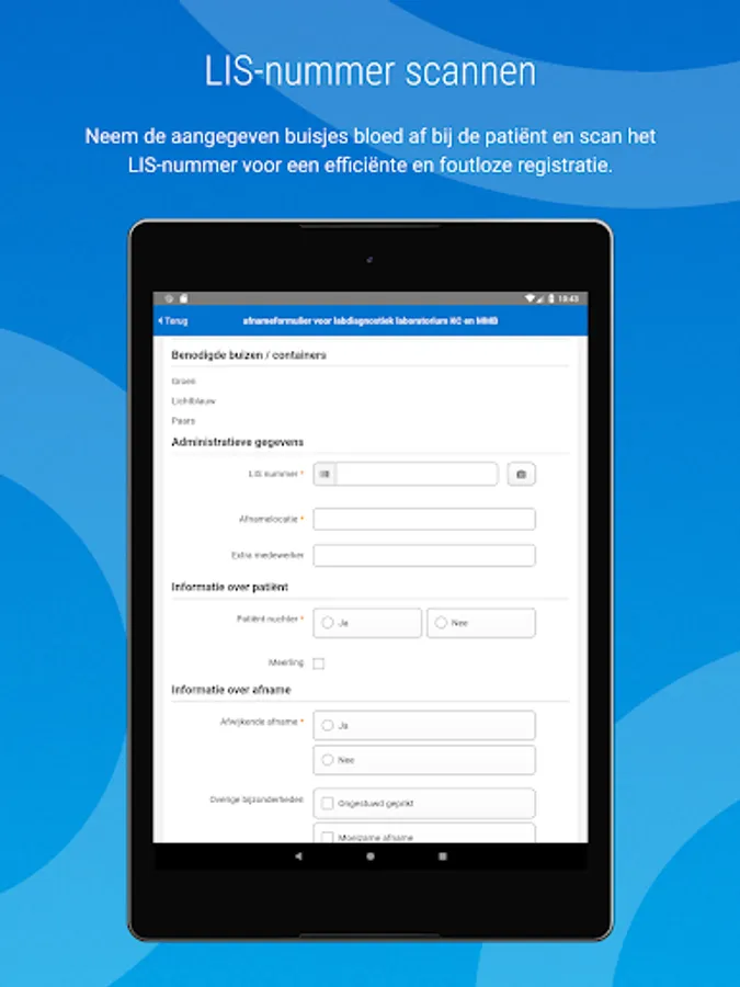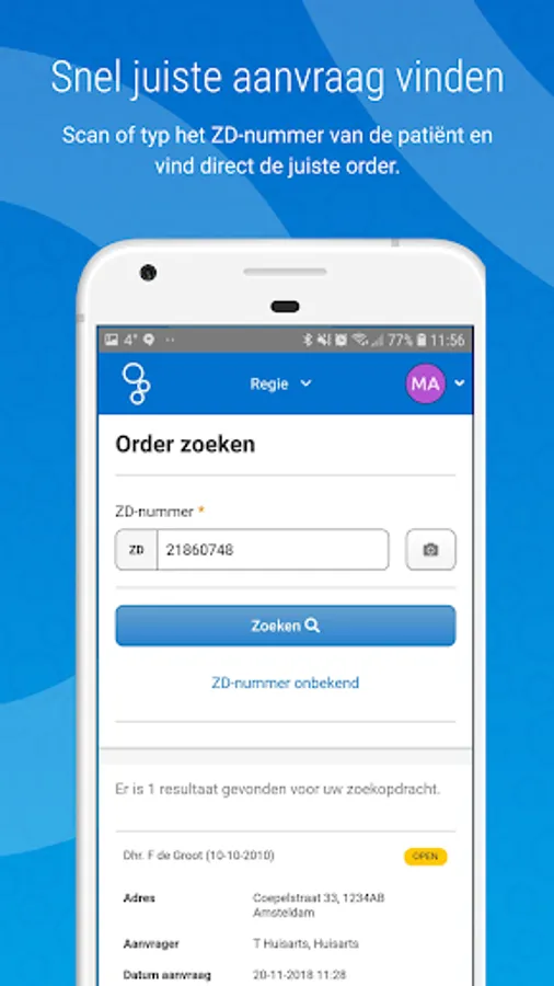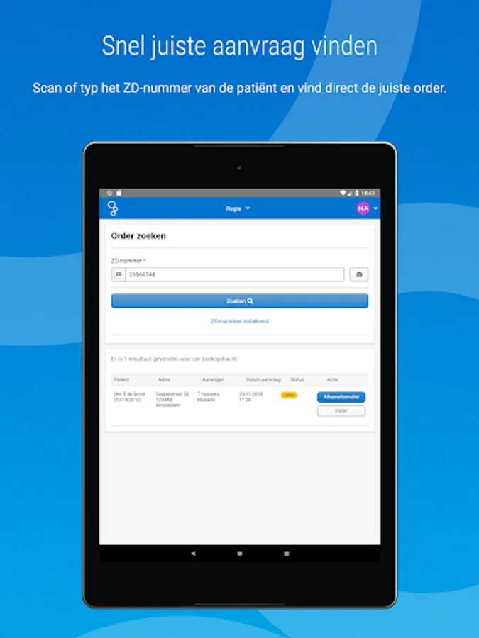 With ZorgDomein Ordermanager, it is possible to process the blood collection on puncture sites or at the patient's home completely digitally by the purchase worker. For this only a mobile device is required.