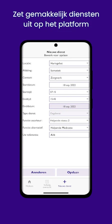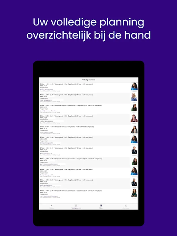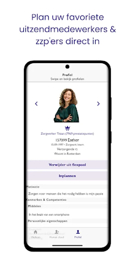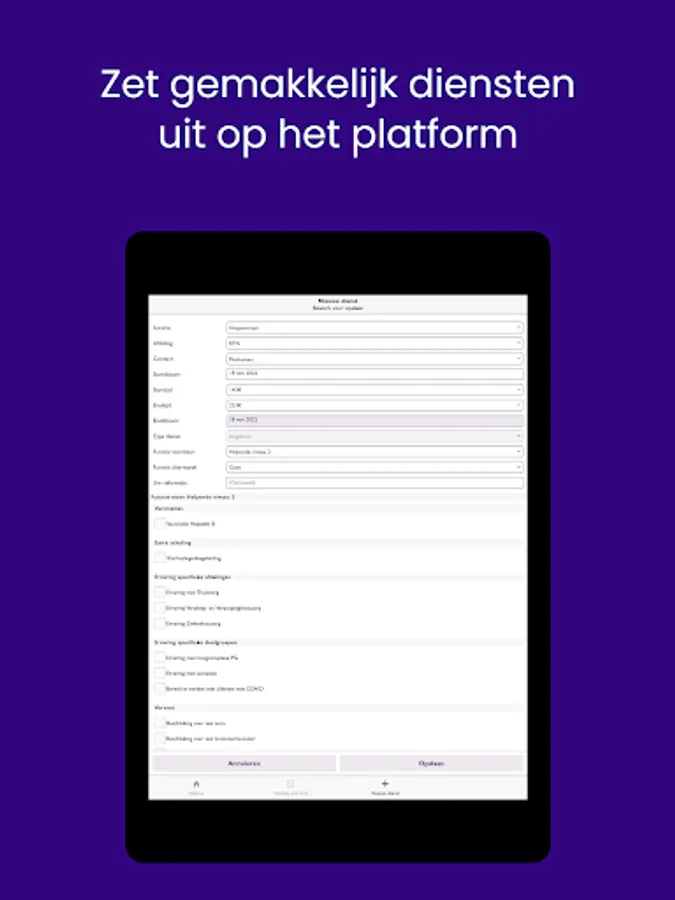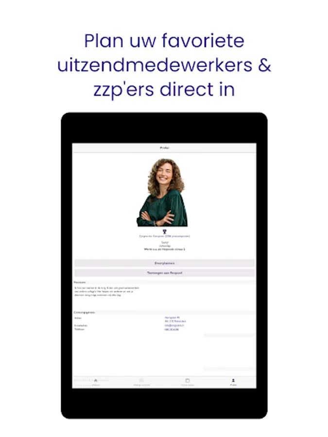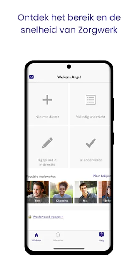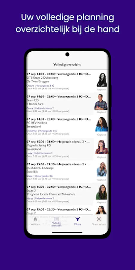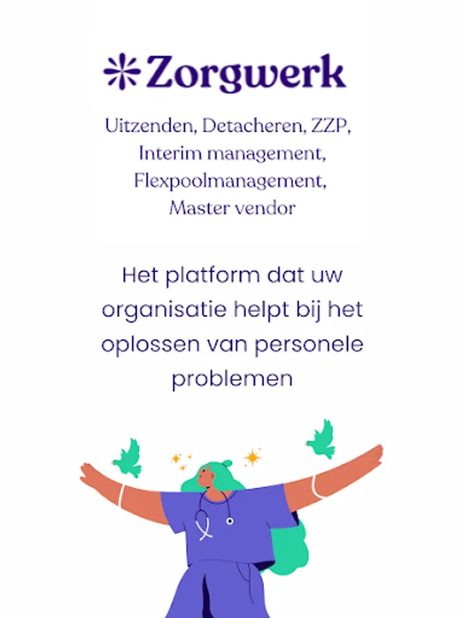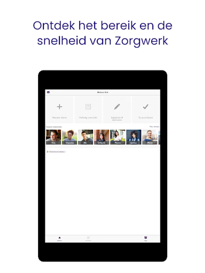 With 24/7 your own employees useful app Zorgwerk reached and all qualified care workers in your region. Employees respond 24/7 at your service, so be fulfilled your out of hours services. Addition, you can swipe through profiles of internal and external staff and invite them to services or even schedule immediately.