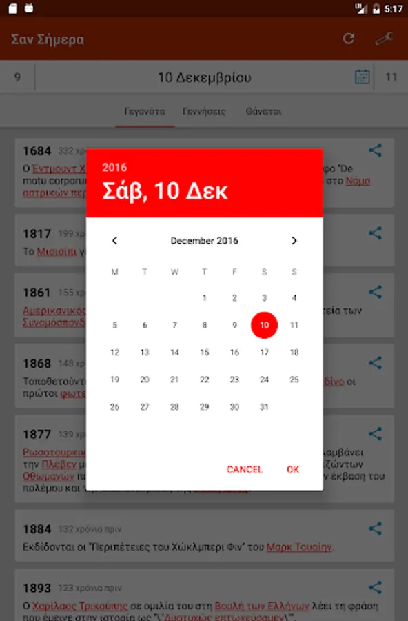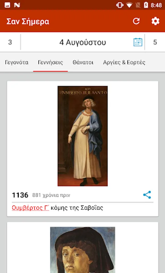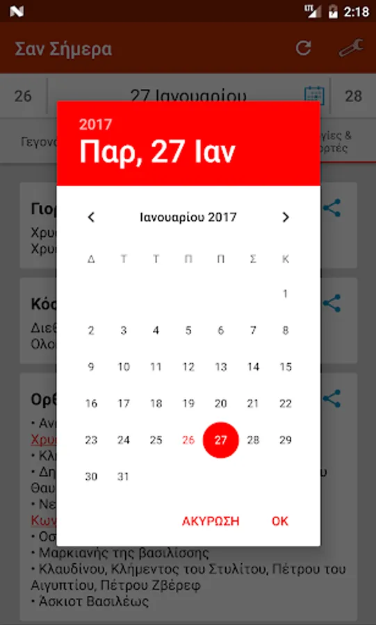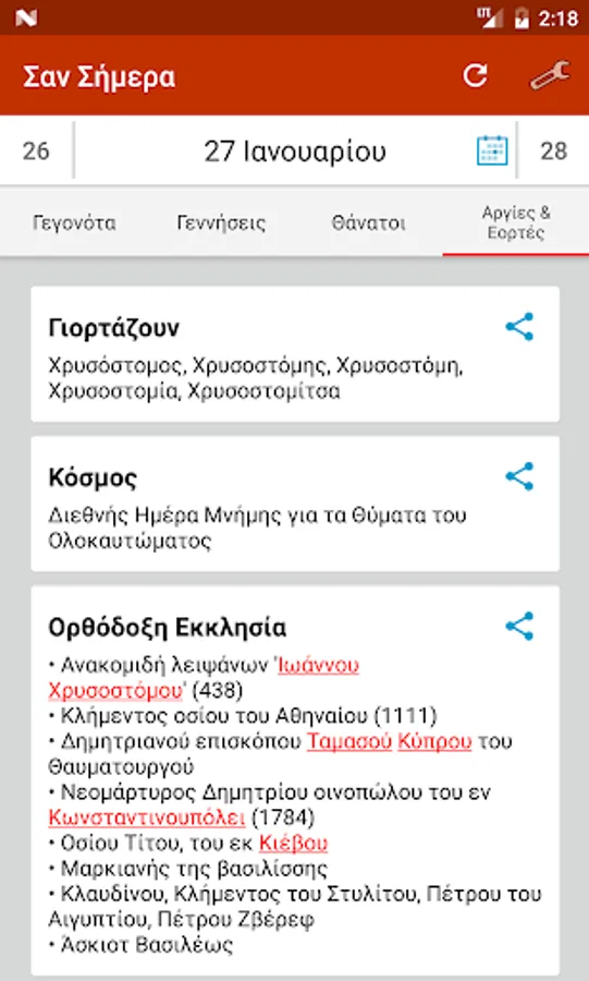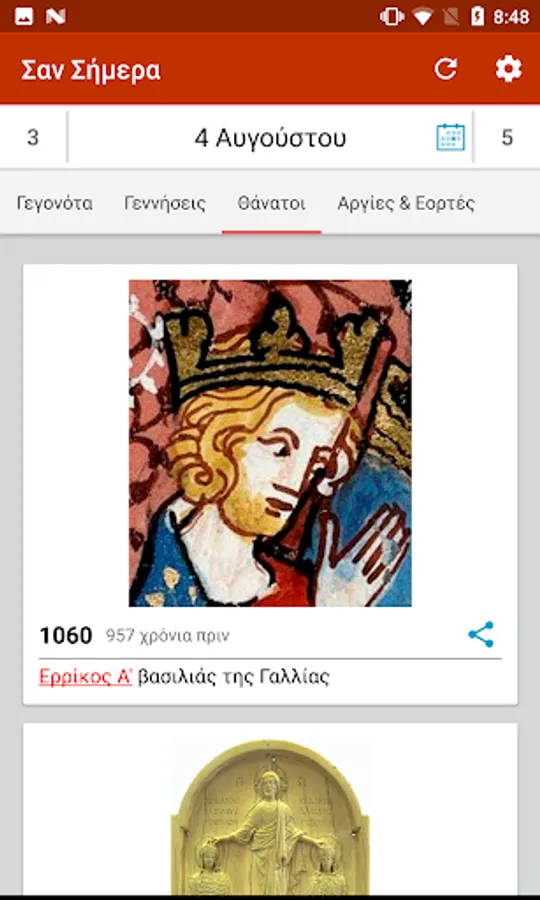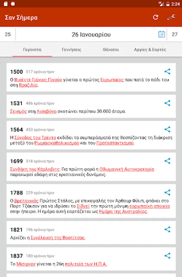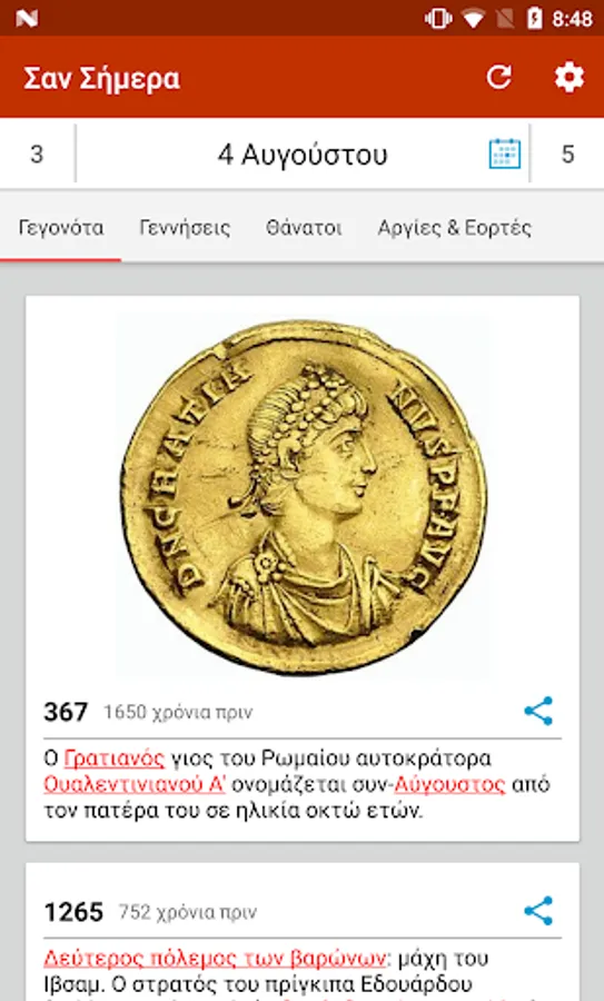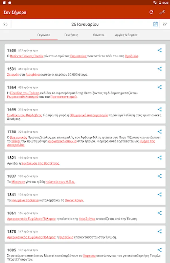 You can choose any day you want using the calendar. Furthermore you have the possibility to sort the events in any order you want and to receive notification with a random fact of the day whatever time you choose.