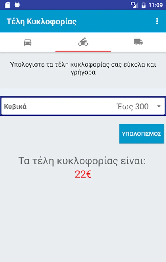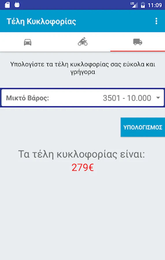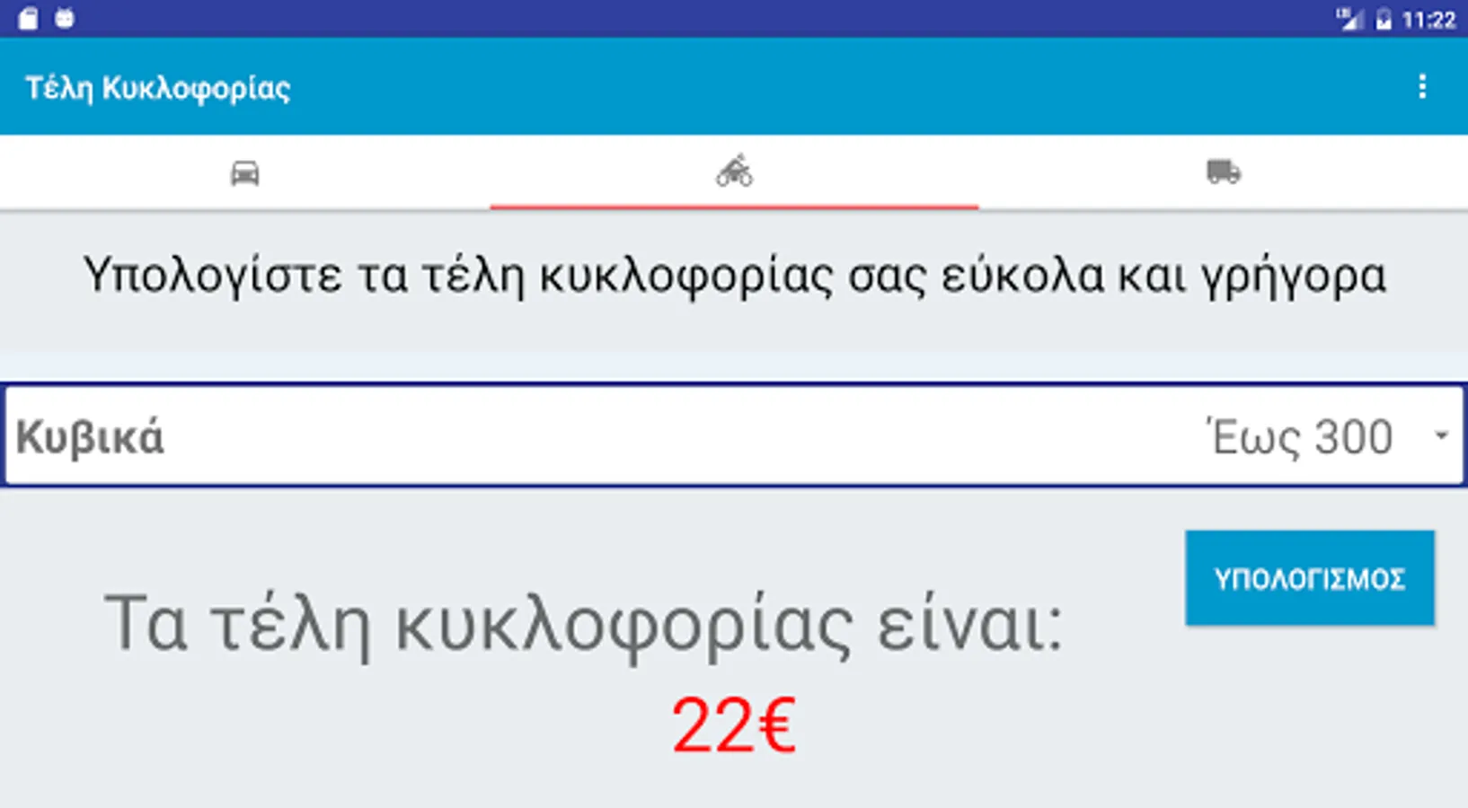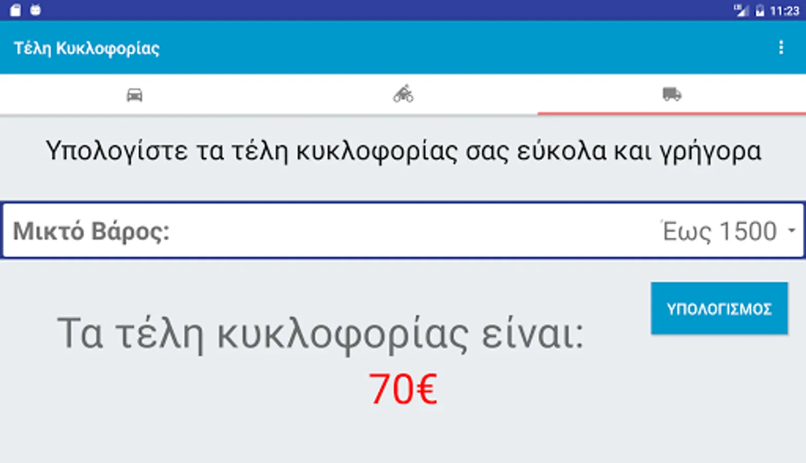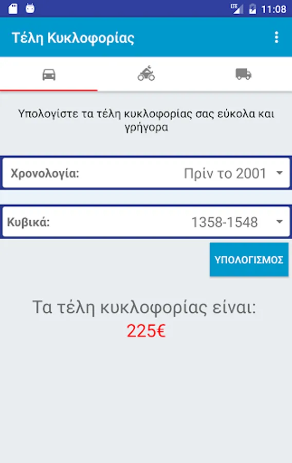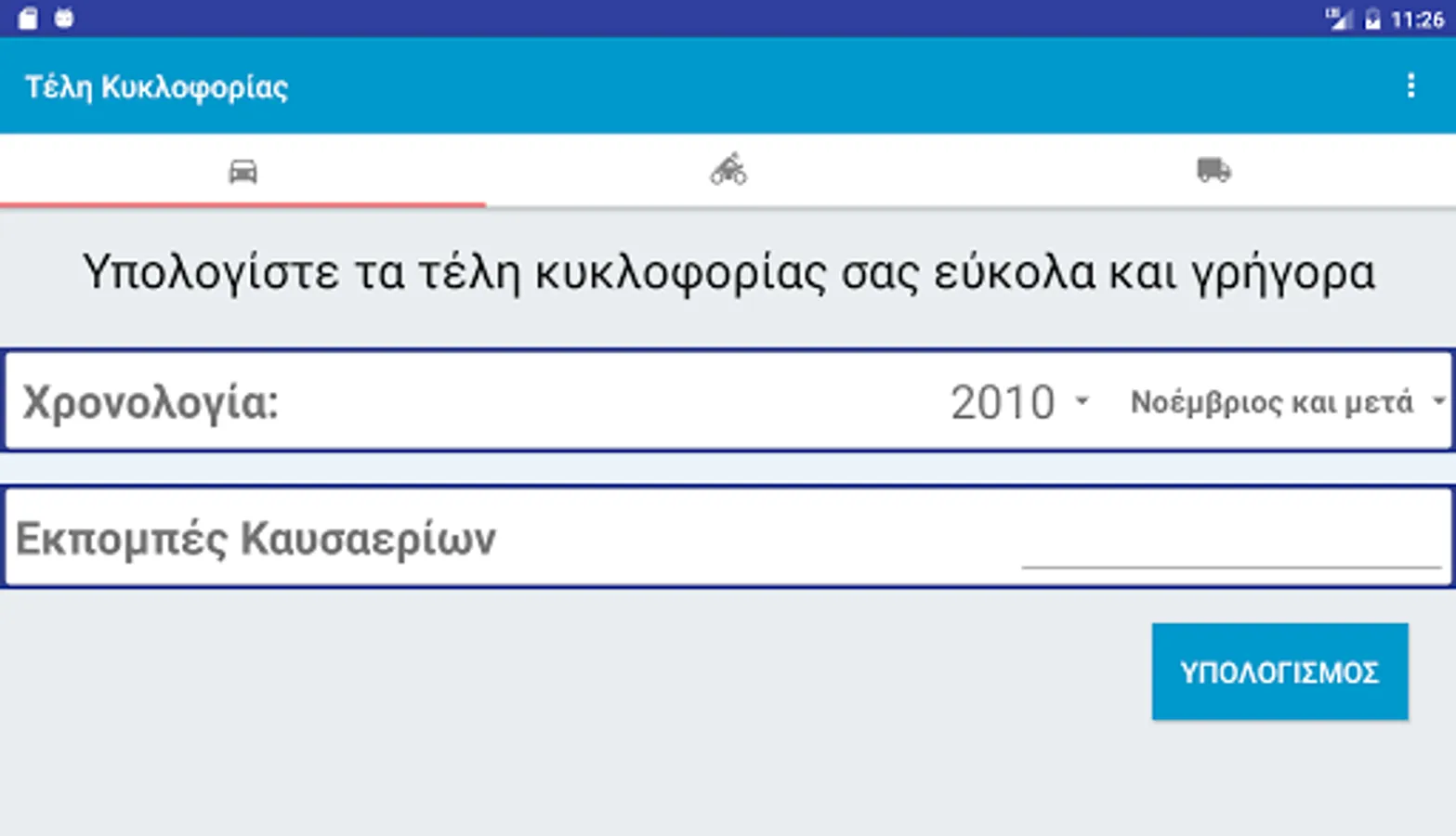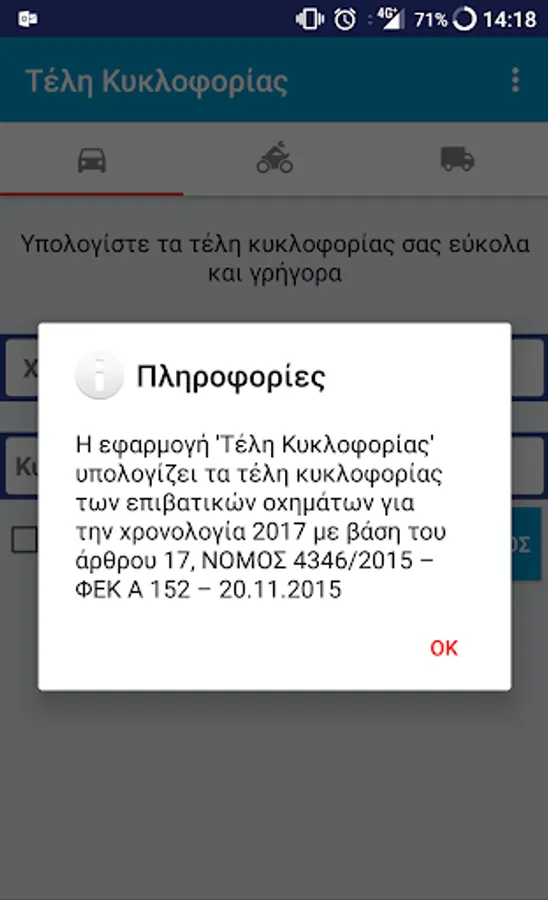 The application calculates the passenger vehicle registration fees for the year of 2017 for Greece on the basis of Article 17 NOMOS 4346/2015 - Official Gazette A 152 - 20.11.2015