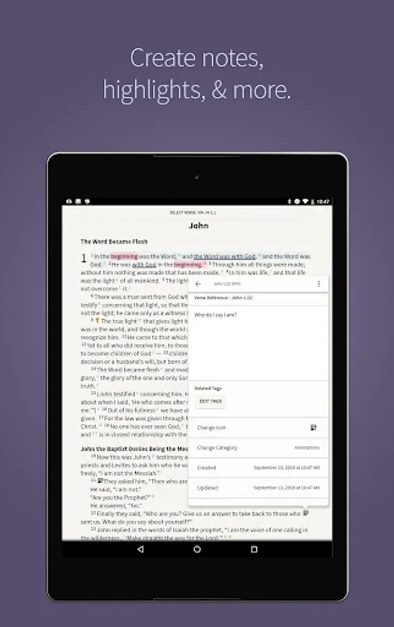 You can highlight and save your favorite passages, drop a book ribbon, create a note, add tags, and sign up to receive a daily Bible verse. Best part? Your highlights, notes, and resources sync between all your devices.