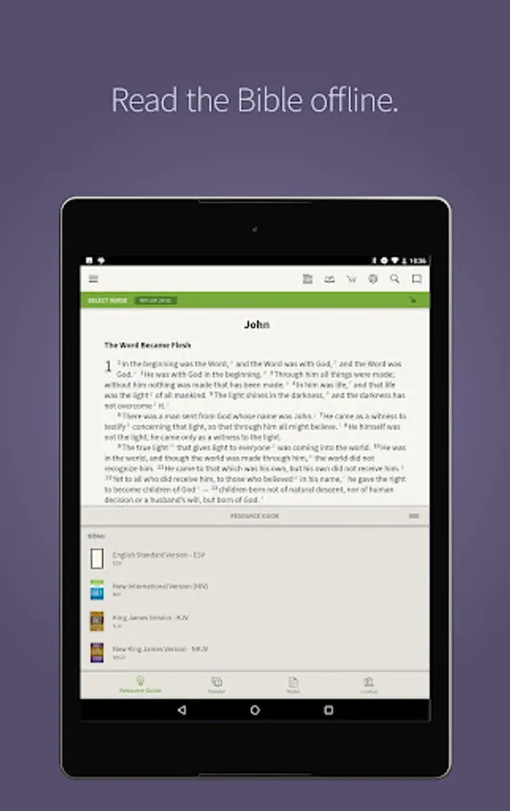 Studying the Bible is the easiest it has ever been. Use the Study Center and Resource Guide tab to access any of the resources available in our app and read them right alongside the Bible of your choice. It even does all the hard work of tracking with you, verse by verse.