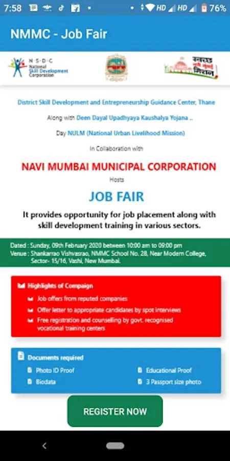 NMMC organised grand Job Fair at Vashi in 2020, where jobless youths of Navi Mumbai got opportunity to get on the spot job offer. Those who could not manage to get selected, were offered Job-Ready Skill-base training in various sectors. Vocational Training providers empaneled by Maharashtra State Skill Development Society – MSSDS were also present at the job fair to register candidates for FREE Training.This year too we have 10 Vocational Training Institutes to offer Free registration and counseling for skill training. Candidates who are not offered job because they lack job skill can attend skill development training from Vocational Training Institutes and gain experience and skill set for job and soft skill.Only those candidates who register online will be allowed to enter JobFair and attend interview for on-spot job offers.