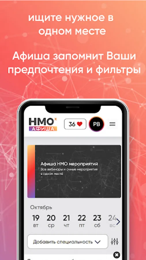 Register on the poster, customize filters for yourself, add events to your favorites and collect NMO points.