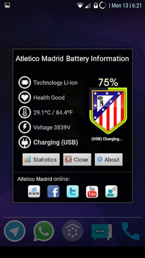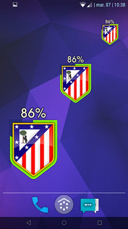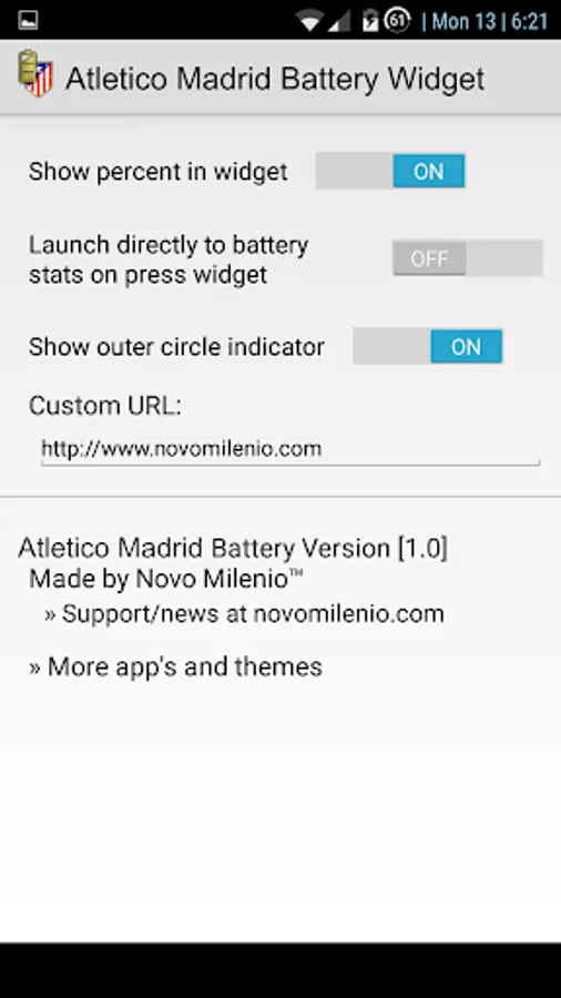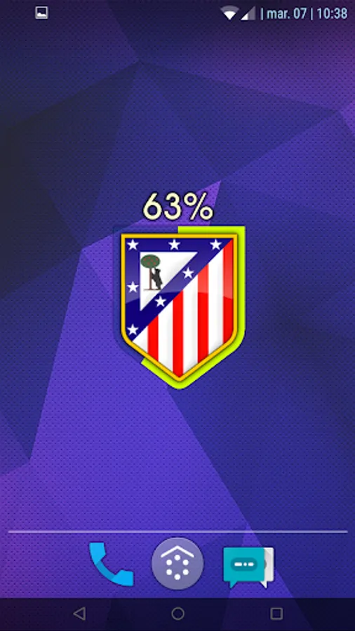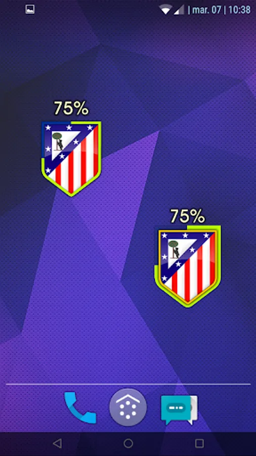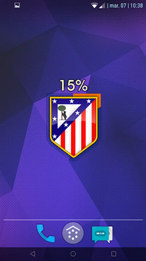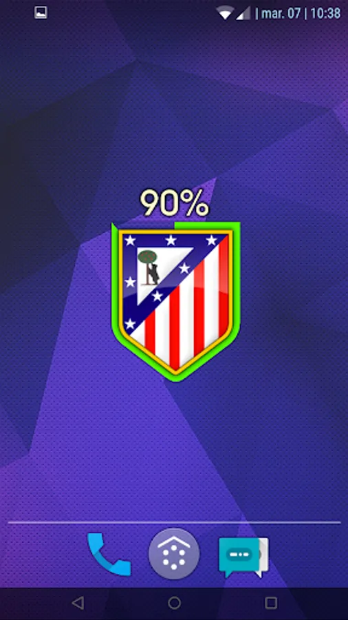 Unofficial widget that displays a circular arc around or inside the shield of Atletico Madrid soccer Spain club. You can see the percentage of remaining battery as well as general information about the battery status, temperature, voltaje, connection,..., and links to the main pages of the club.