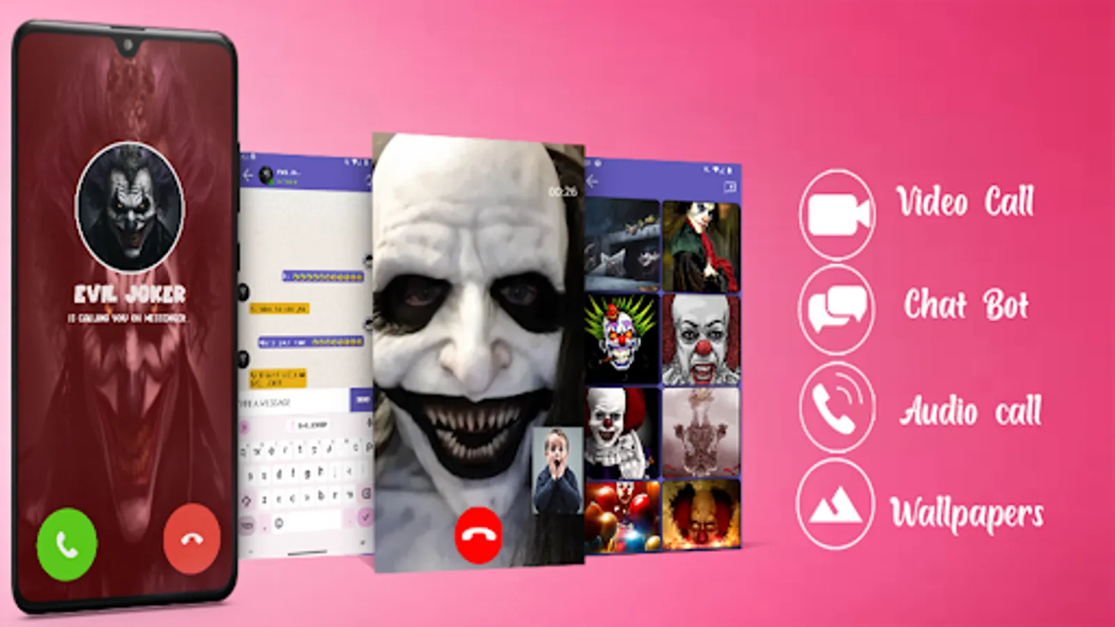 this app lets you experience the thrill of having a fake video call, fake chat with evil joker don't call at 3am , and also it allows you to use some of the best wallpapers of this character.