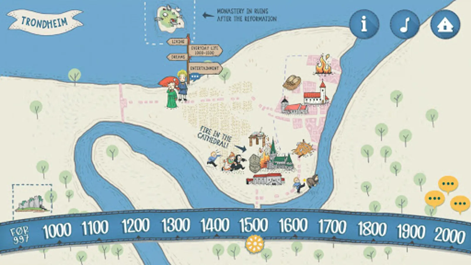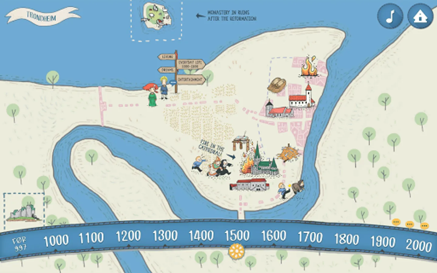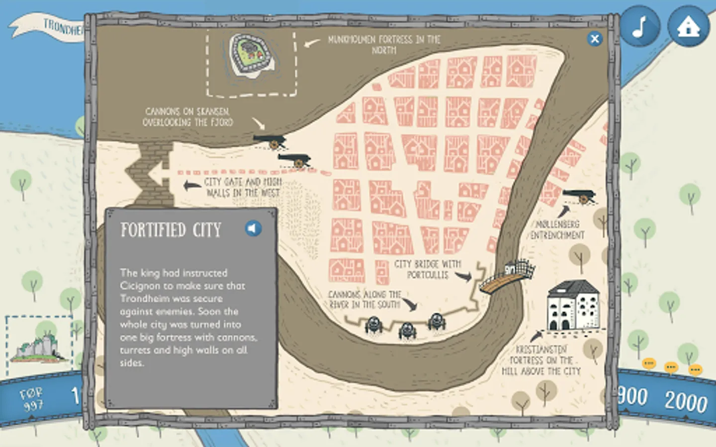 This digital history books is an exciting travel through Trondheim's 1000 year old history. You will meet great kings, funny characters and ordinary children who played in these streets many, many years ago. By means of an interactive time line you can travel through the centuries, and make the city develop before your eyes.