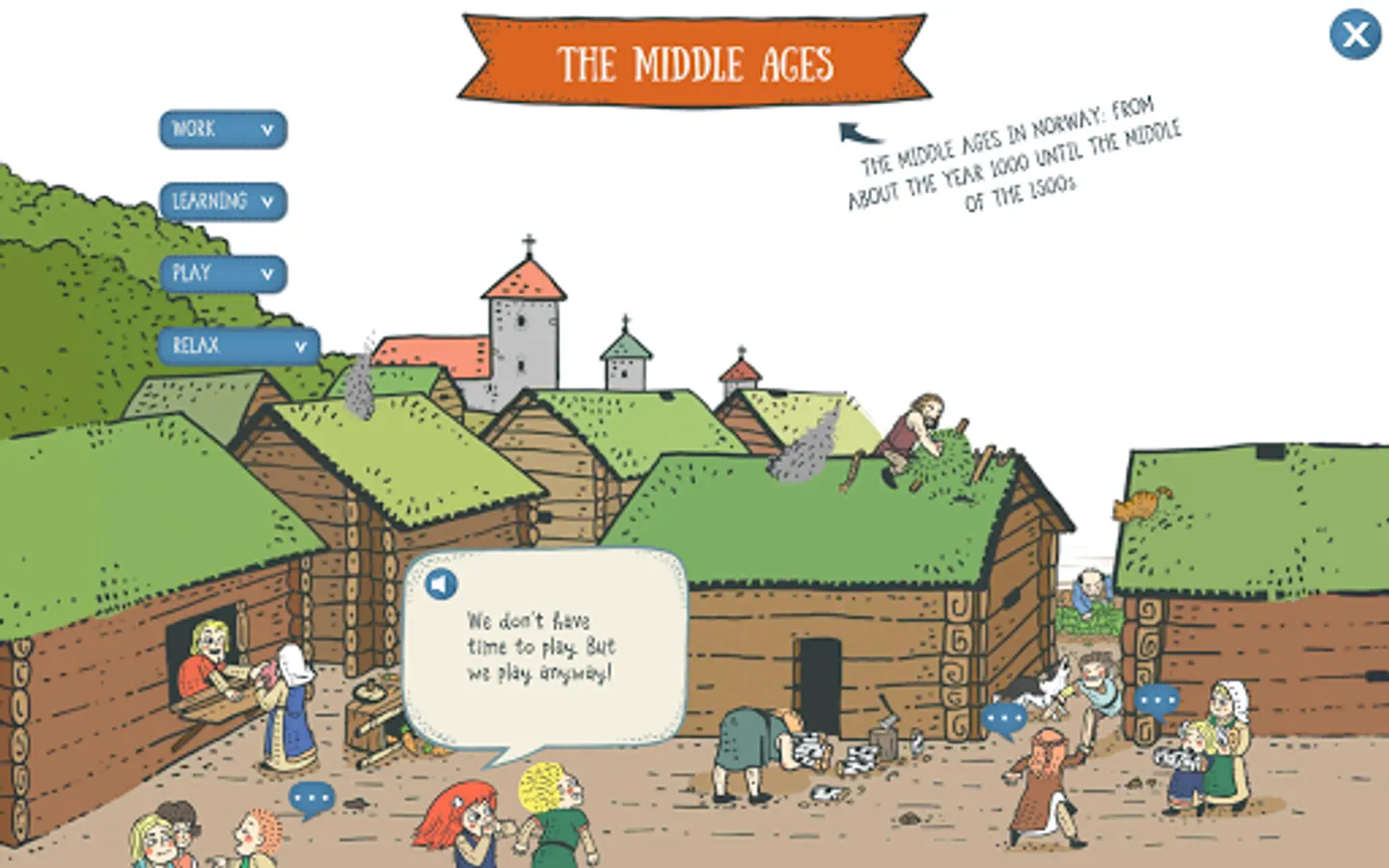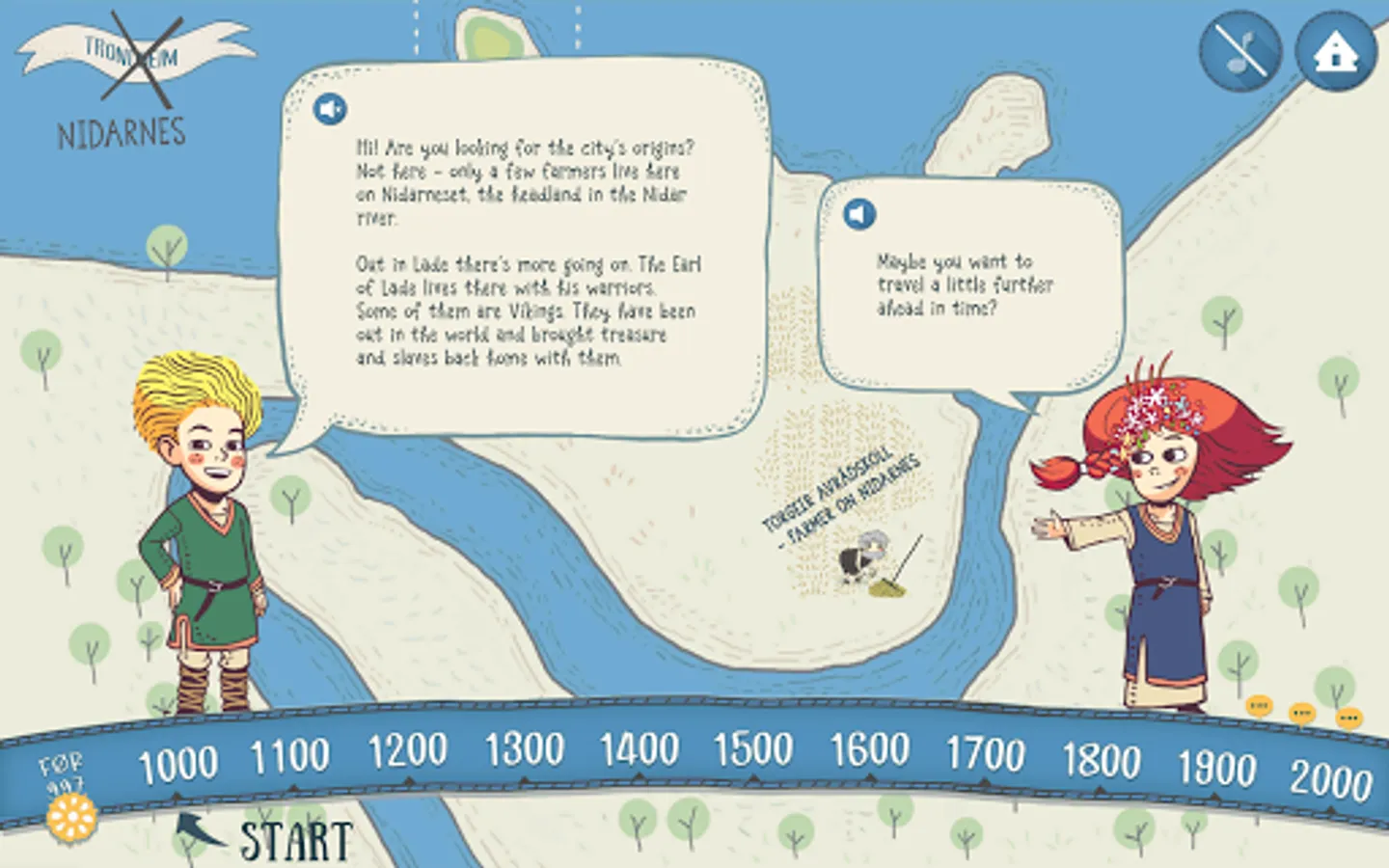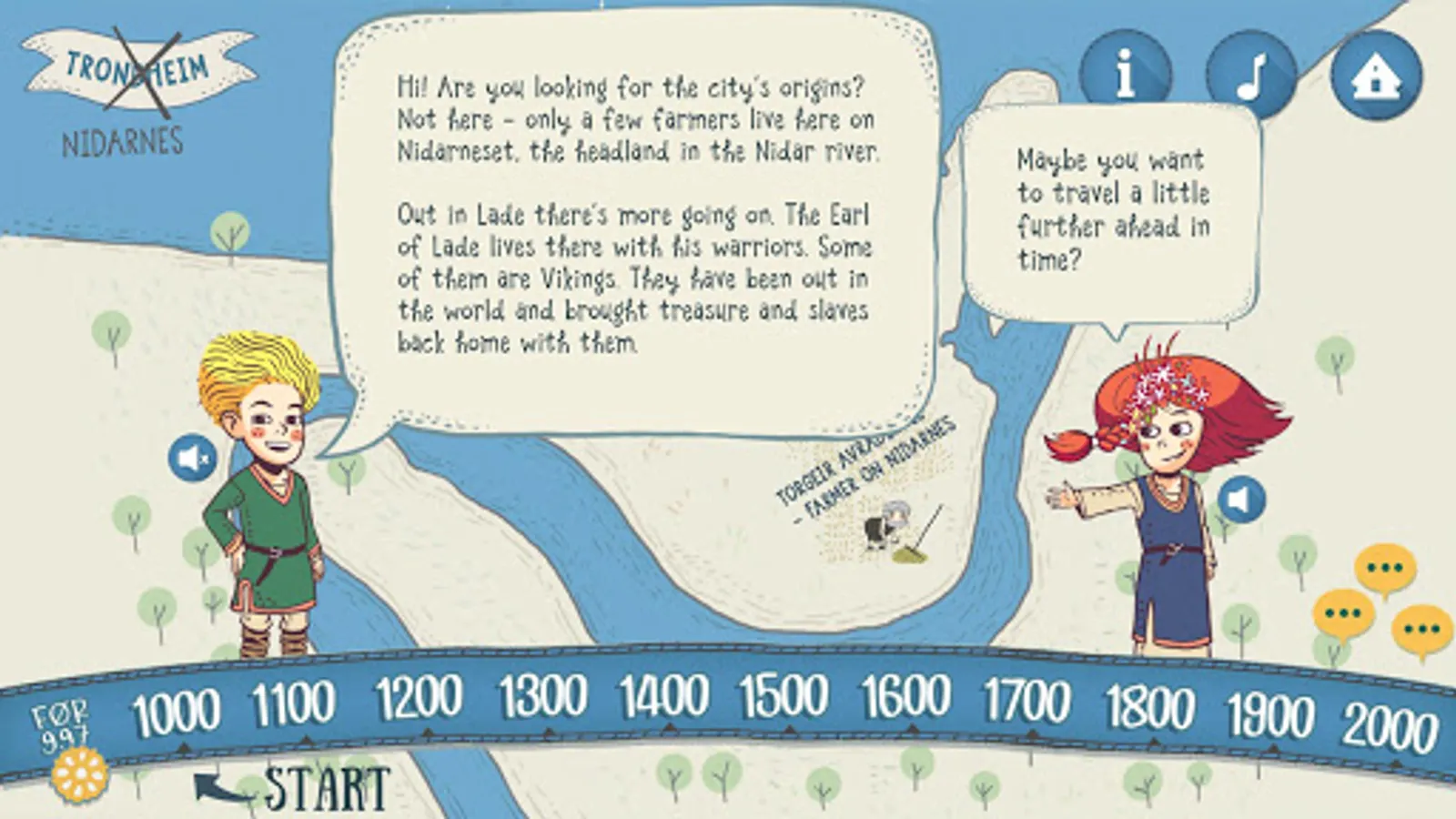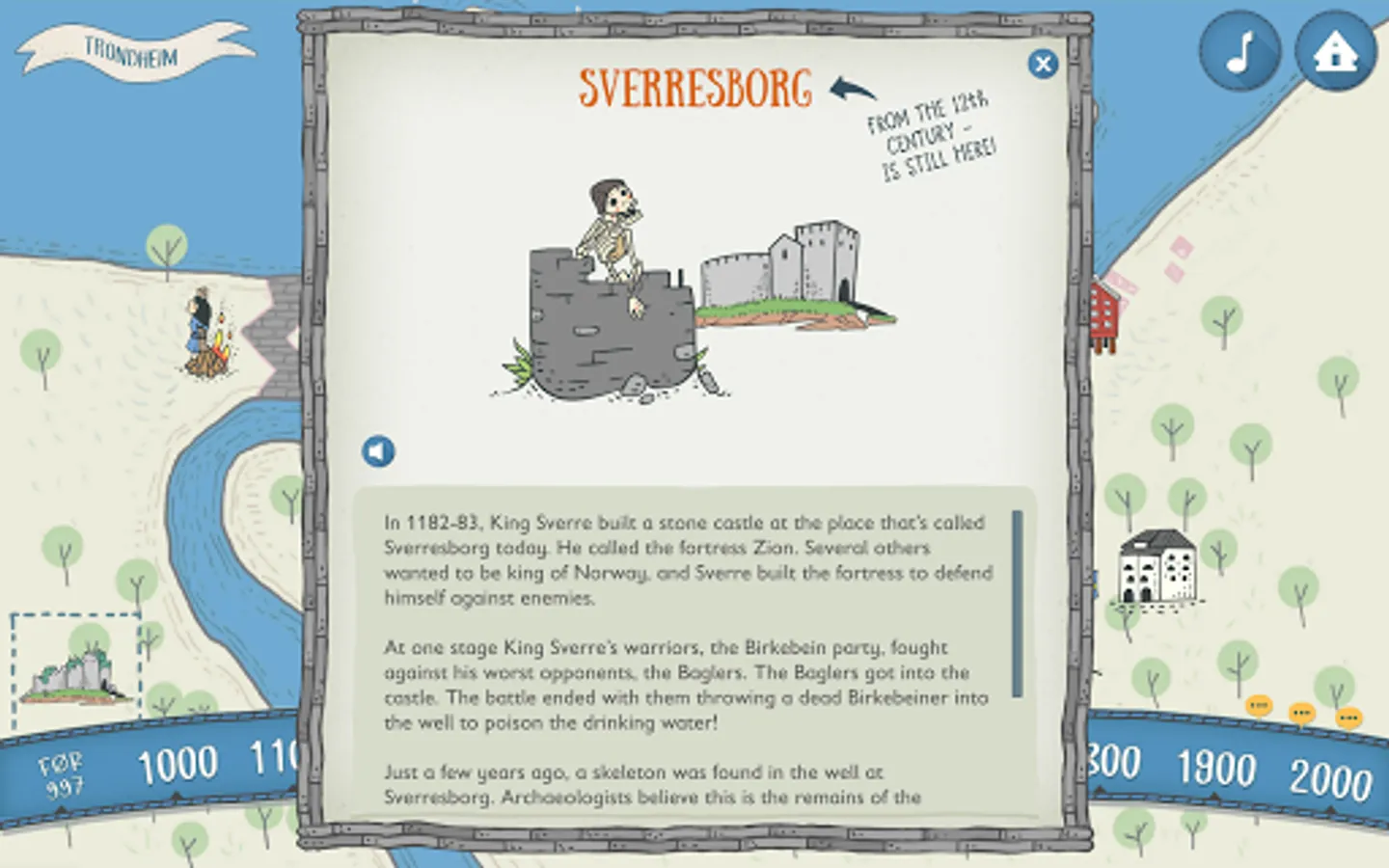 This digital history books is an exciting travel through Trondheim's 1000 year old history. You will meet great kings, funny characters and ordinary children who played in these streets many, many years ago. By means of an interactive time line you can travel through the centuries, and make the city develop before your eyes.