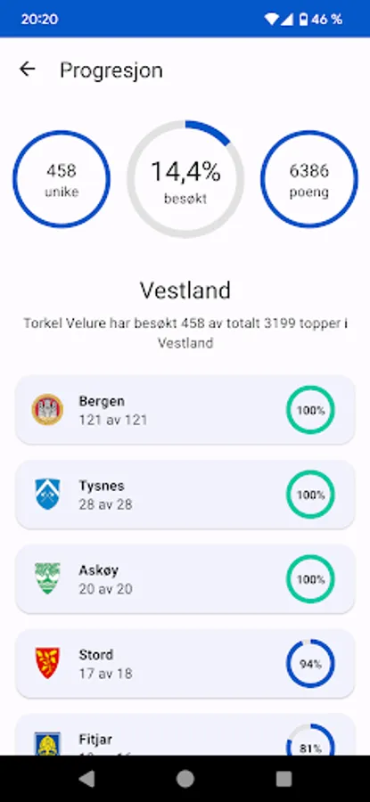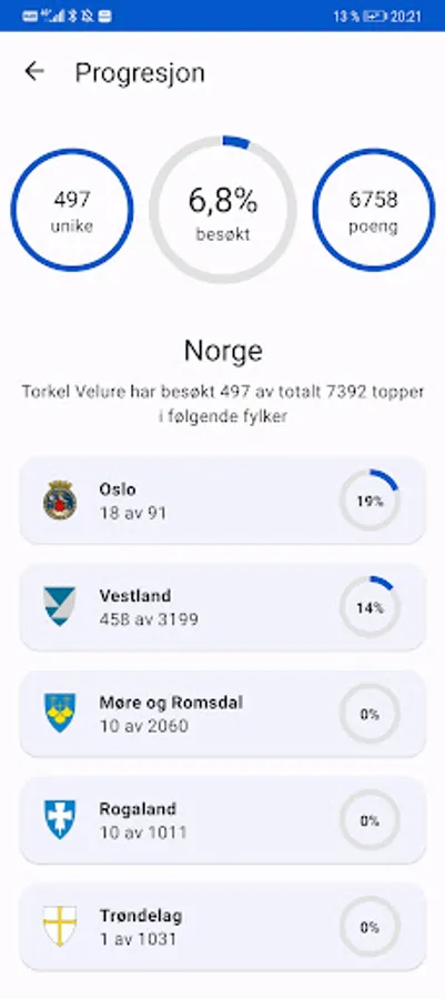 Get an overview of all mountains you have climbed, how many municipalities you've visited, and compete with others on the leaderboards.