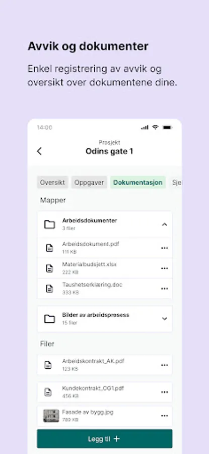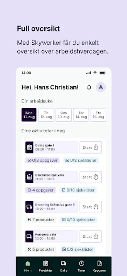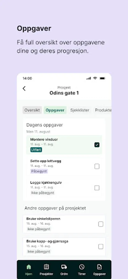 Fra denne appen får feltarbeidere enkel tilgang til prosjekter, arbeidsoppgaver, HMS-dokumenter, personlig arbeidsliste og mye mer.