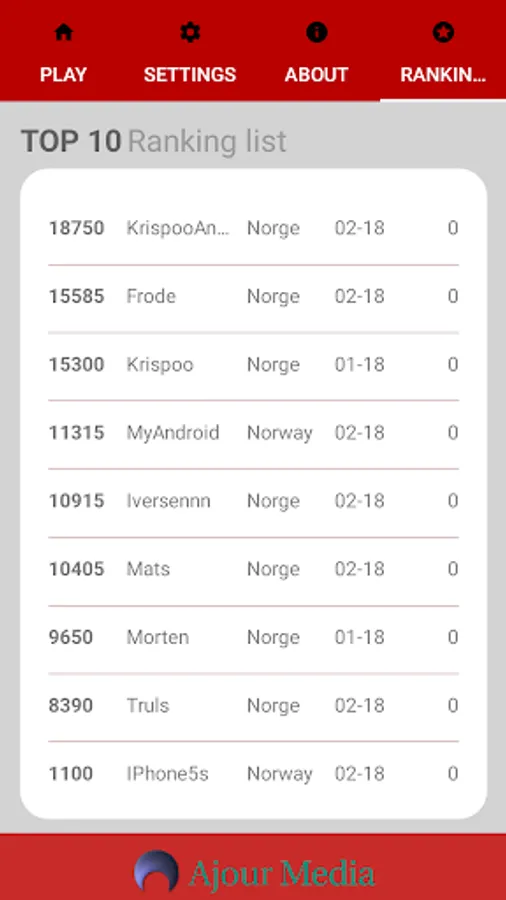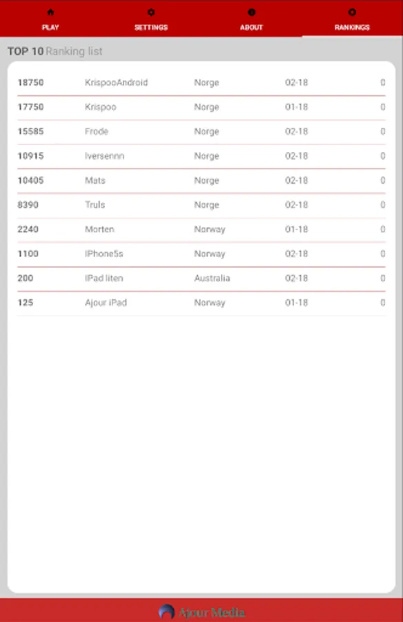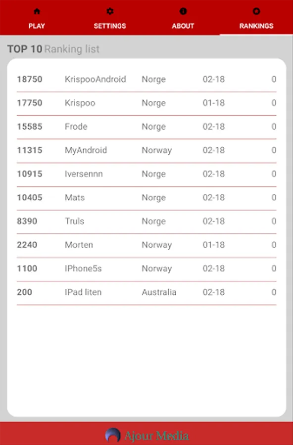 - All players who has created a username will fight for top rankings throughout the year. You can always keep track of where you are placed on the ranking list and your position compared to other players. At the end of each year, players who are placed on top of the score list will be honored.