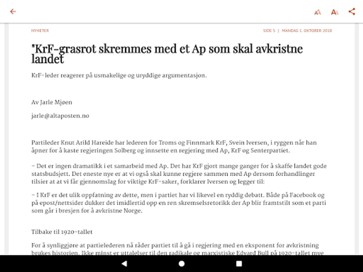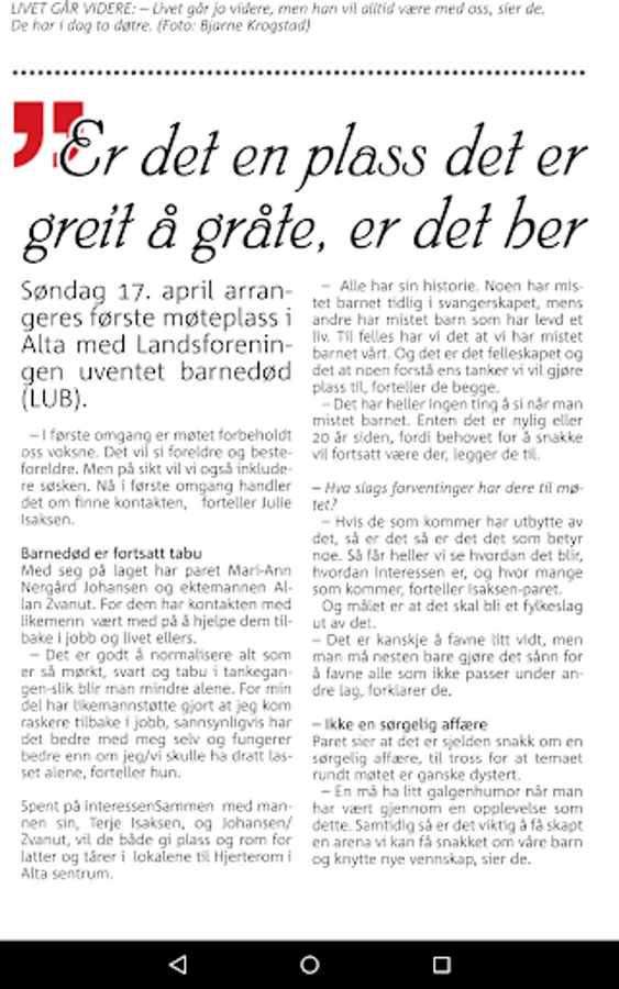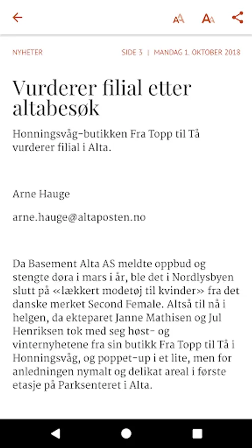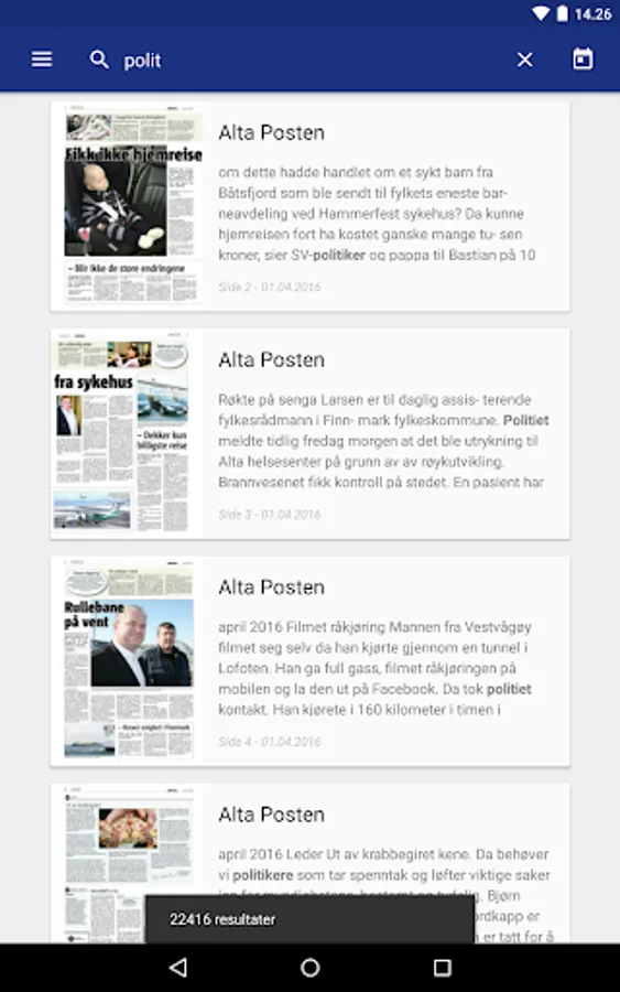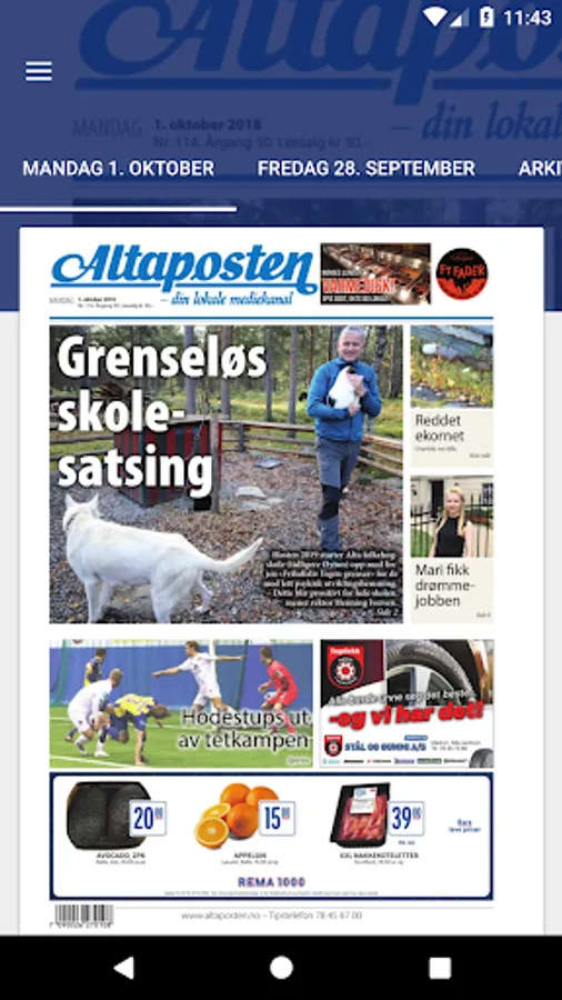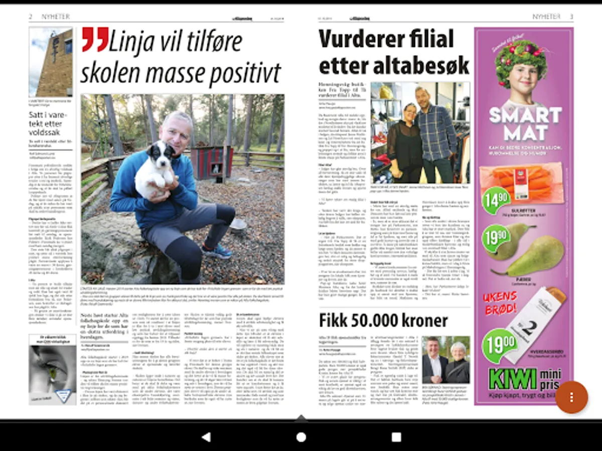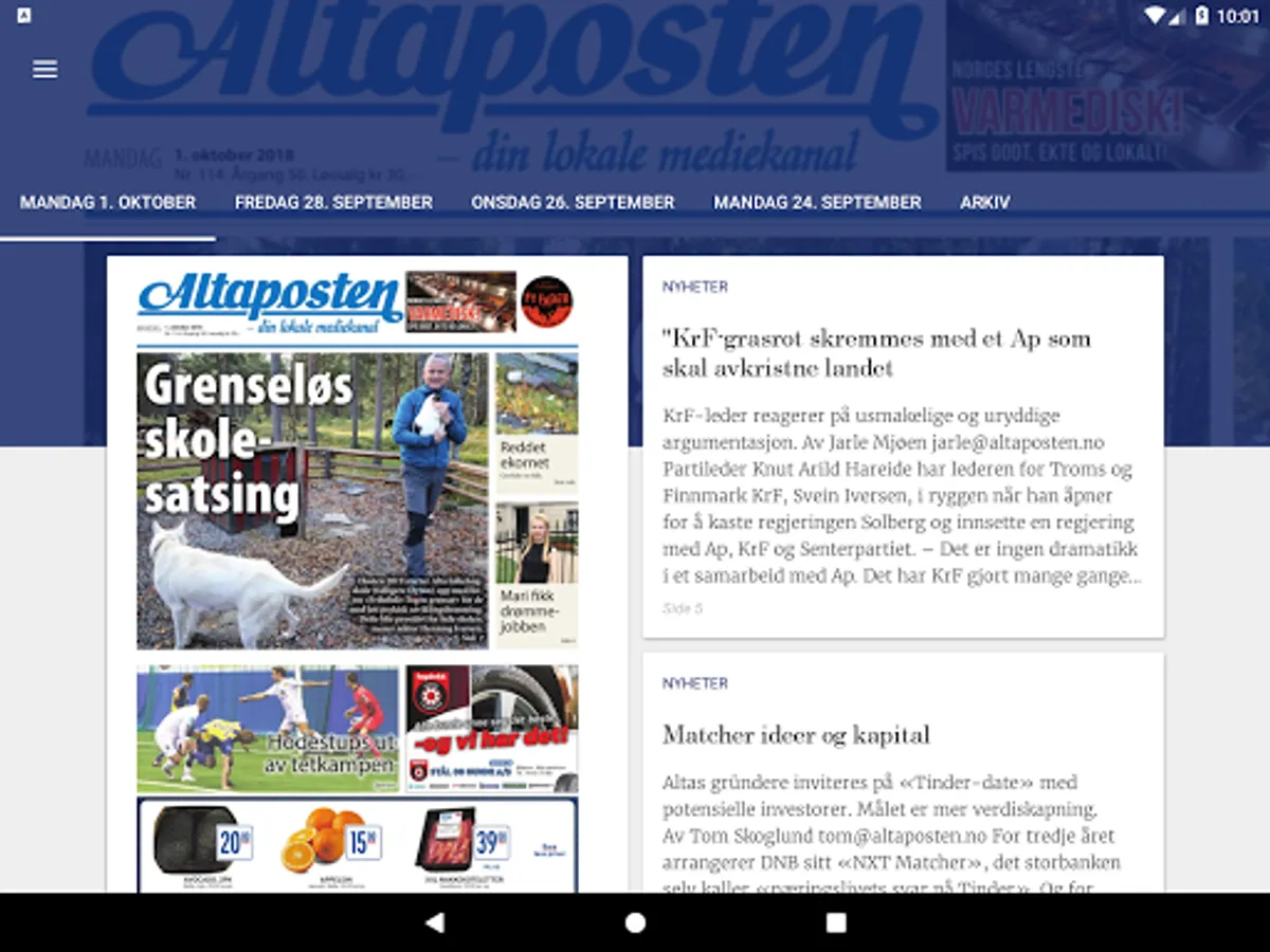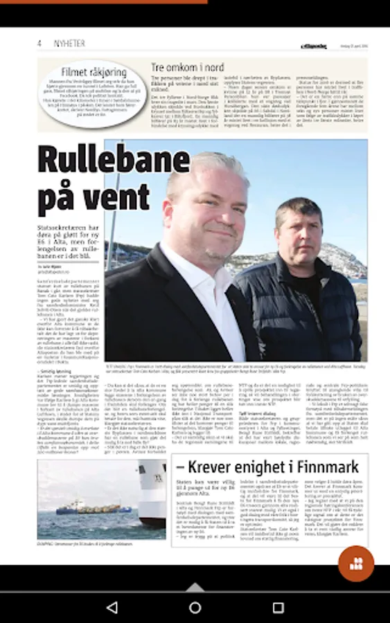 With Altaposten ePaper can read the print newspaper in a format that is tailored to your Android mobile or tablet. Download the app today, it's free. To read ePaper app you must have a subscription or day pass from Altaposten.