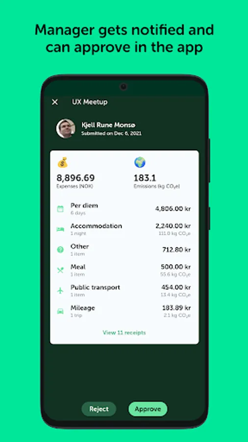 • Approve or reject expense reports directly from the mobile app or the admin web
