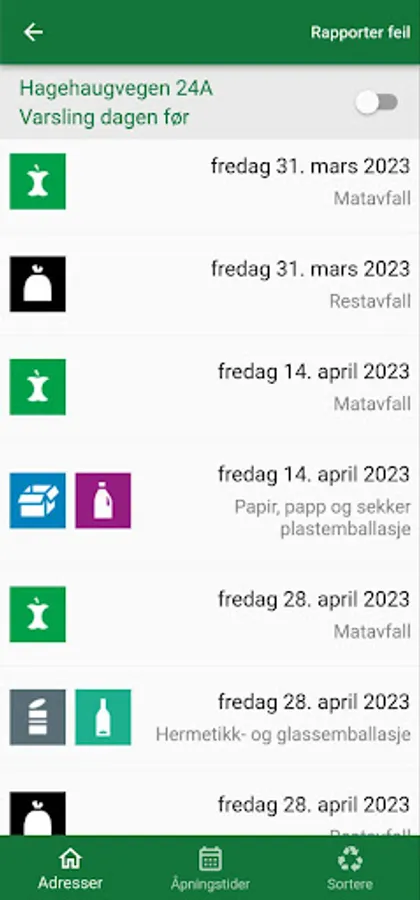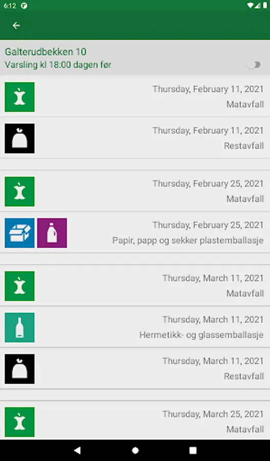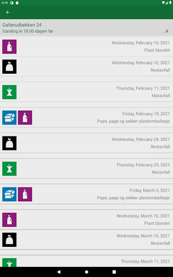Calendar for emptying residual waste, food waste, cardboard, paper, beverage cartons, canned food, glass packaging, plastic packaging.