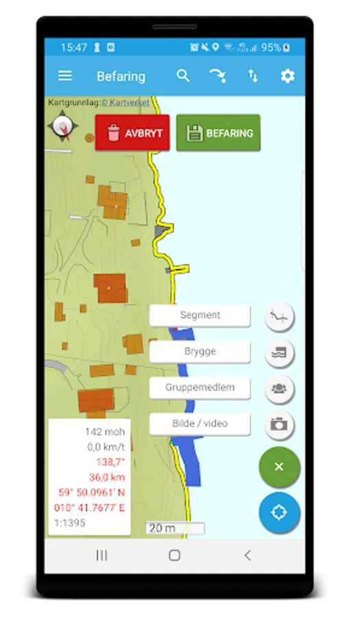 The app works offline and the user uploads the collected data when an internet connection is available. A generalized shoreline and maps are downloaded upfront if needed.