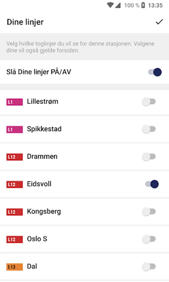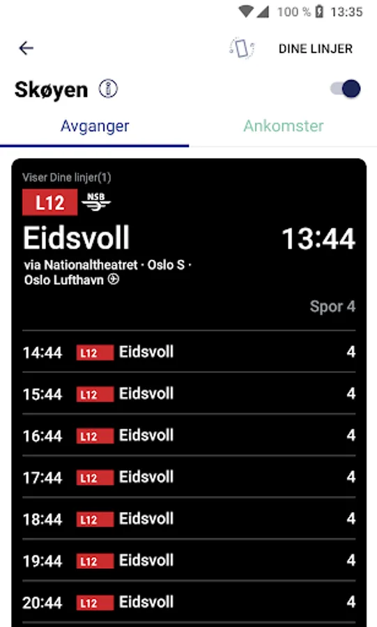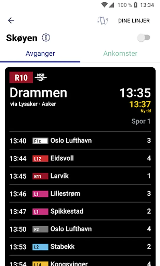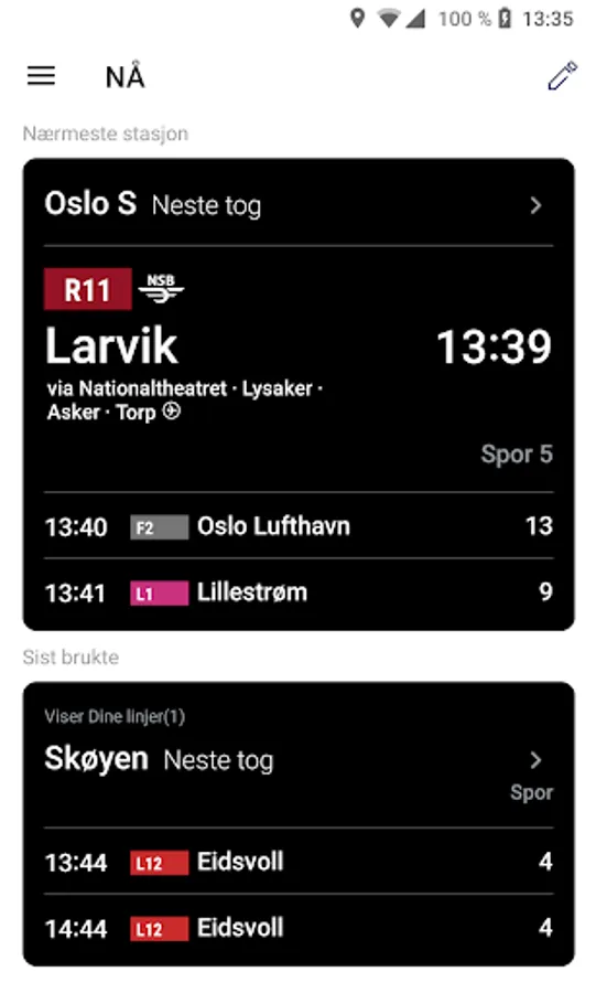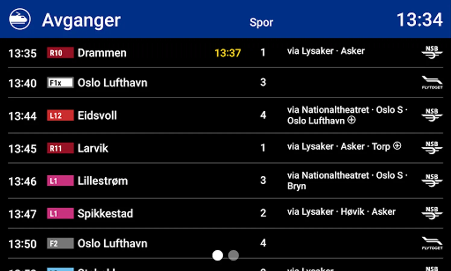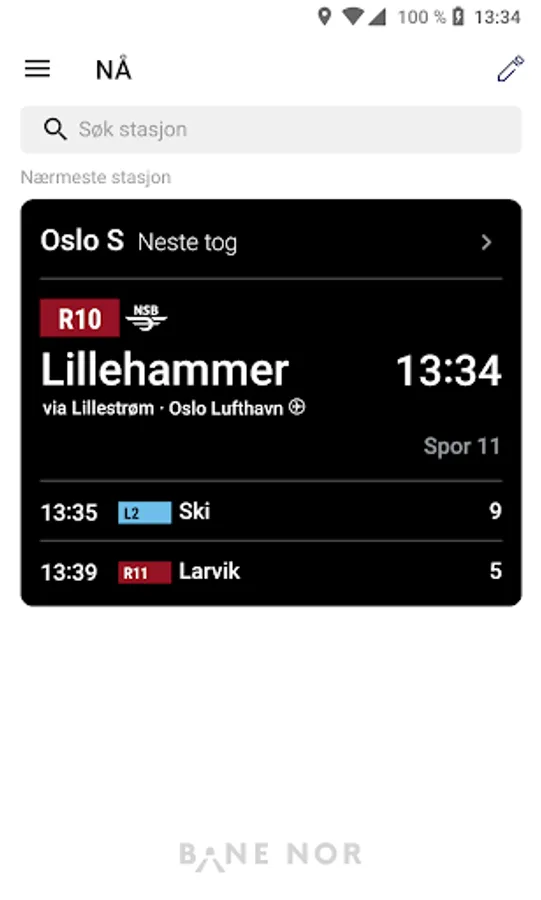 In the travel app NÅ you can see all train departures and arrivals in Norway. With NÅ you have the station screen on your mobile, with access to the information you find on the screens at the railway stations. With NÅ you can check if the train is on time before you leave home, or on the way to the station.