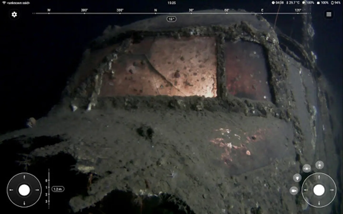 The app shows telemetry data from the drone such as depth, heading, orientation, water temperature, and battery level, as well as a full HD 1080p/30fps video stream.