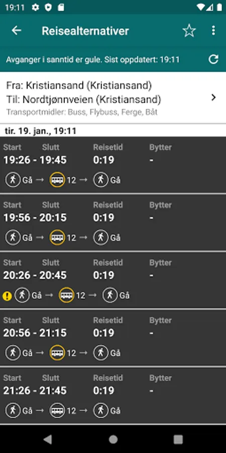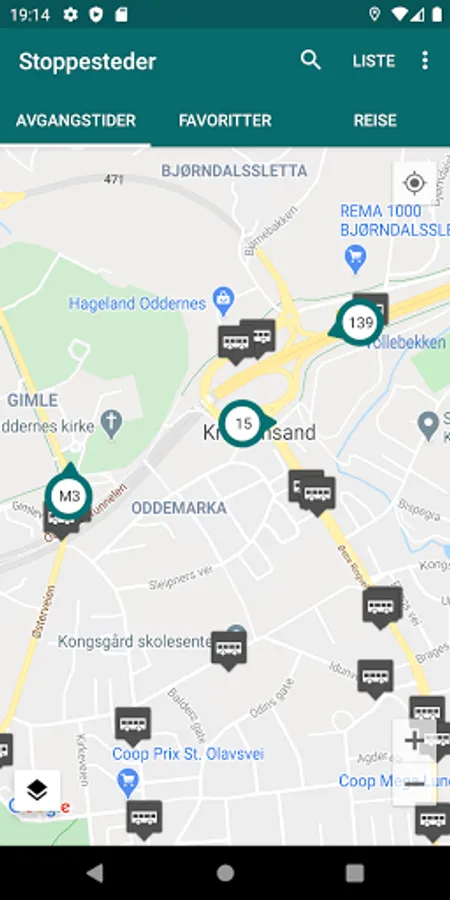 The app gives you scheduled departure information on bus, boat and train in both the Agder counties, as well as allowing you to search out the most convenient way to travel from A to B.. You can plan your itinerary from your nearest stop from a specific address or out from a map search. The app provides departure times and travel times in real time, where available.