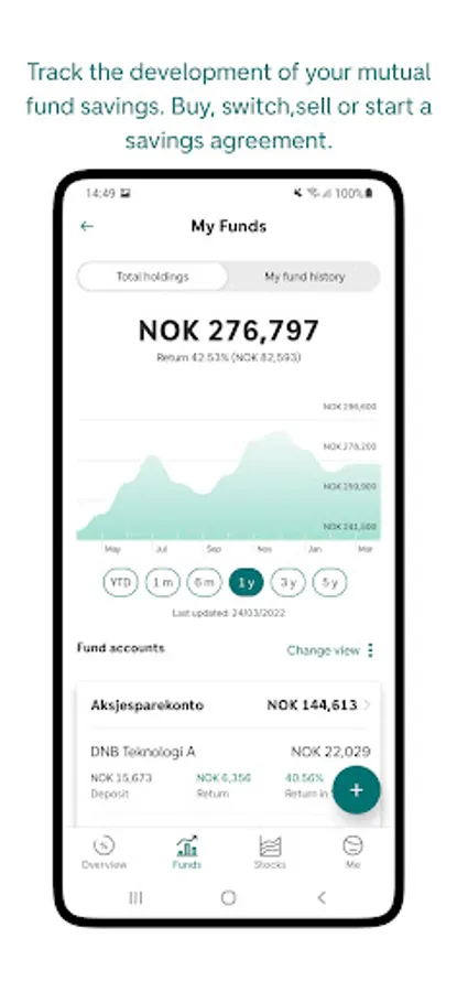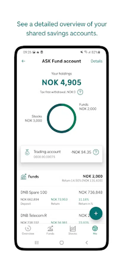 You can now log into the Spare app with your BankID from any bank. Get an overview of how much you’re saving in DNB and other banks. It’s easy to get started with regular saving, whether in mutual funds, equities (shares), or in a savings account. Small, fixed amounts can get you a long way. Explore the possibilities and reach your goals in Spare.