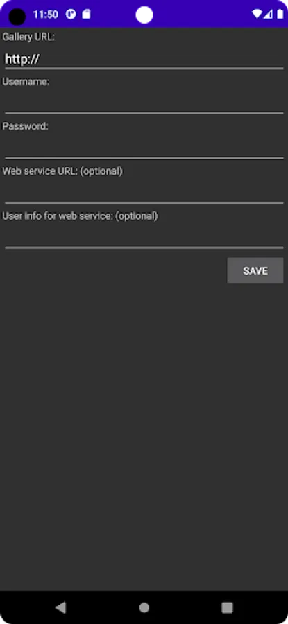 The app has the ability to download username and password defaults from your gallery install. Add a file called gallery_share.txt to the root of your gallery install containing: