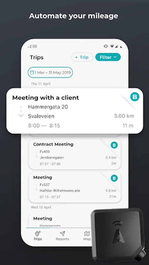 Automate adding purpose and trip type. You can easily modify your trips on the go and send reports to admin.