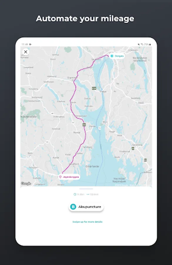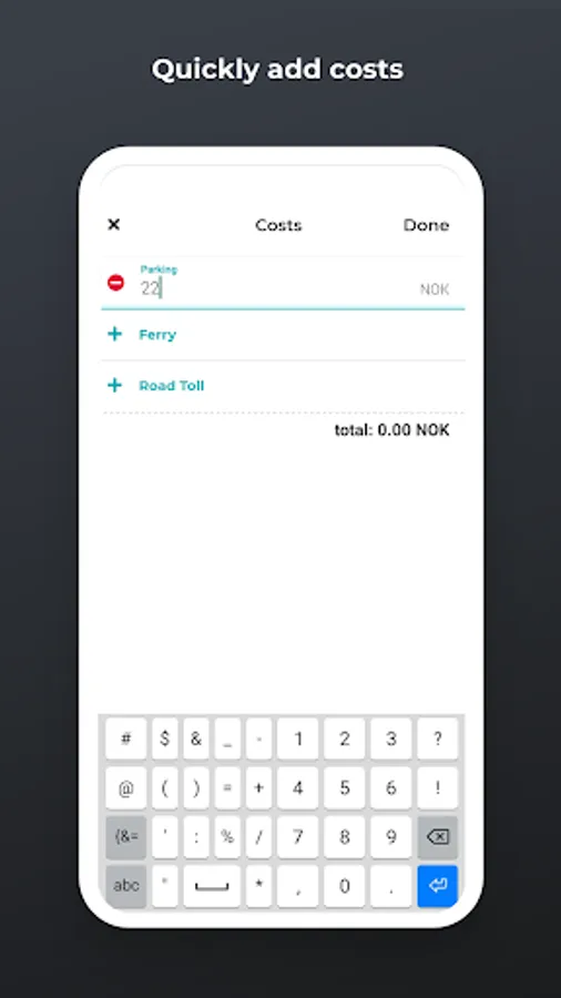 Add parking or toll costs easily and use automatic cost features that are available in Norway.