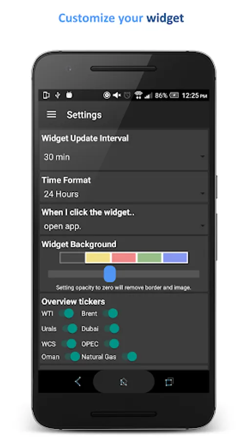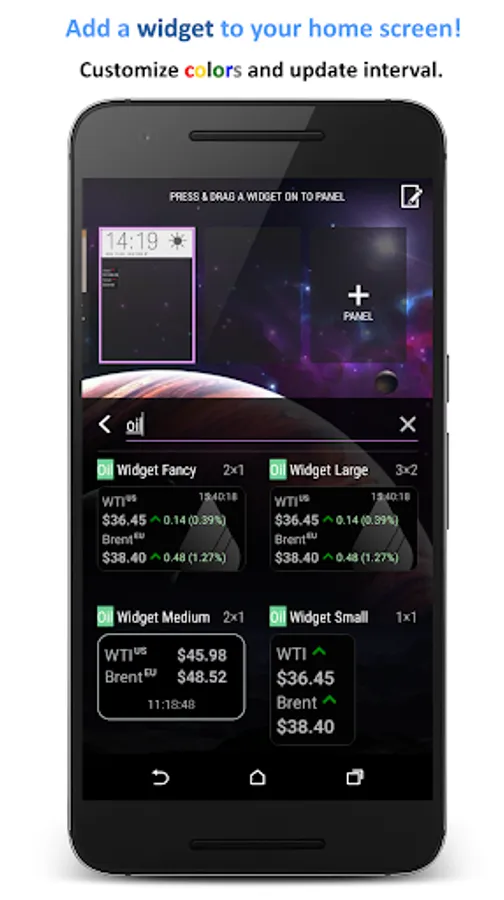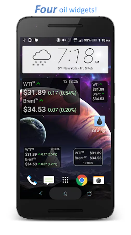 - Four home screen widgets displaying WTI oil price and Brent oil price, with customisation options.