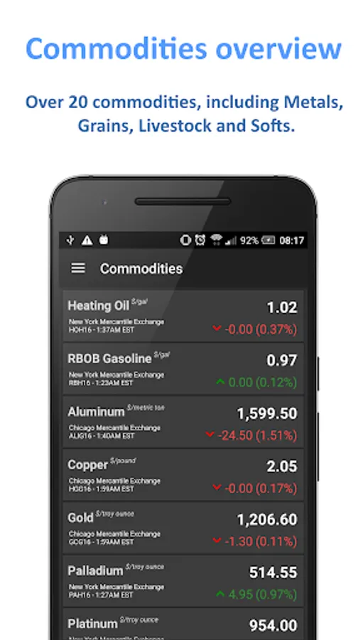 - Commodities overview, including metals, grains, livestock, and softs.