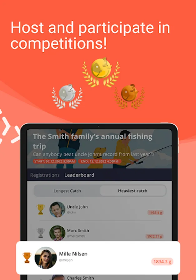 Fishbuddy Competition Tool is the world's first self-powered competition tool. Here, everyone can compete against each other and see who is the best fisherman. The app acts as a judge, organiser and displays an interactive leaderboard. 2 or 2 million fishermen? No problem. And it's all free.