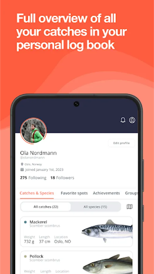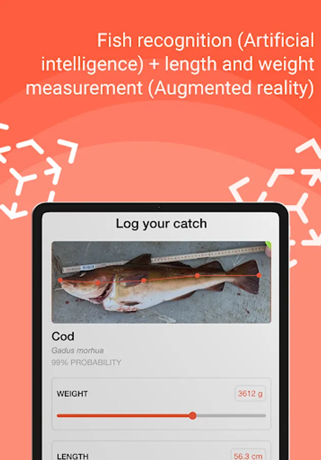 Using advanced camera technology and our own team of AR and AI developers, we've created the world's best fish recognition feature. By including AR, we can accurately measure length and provide an estimate of weight. This gives you quick and easy information, and if you share it with us, it will contribute to the management of SDG 14: Life below water.