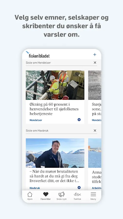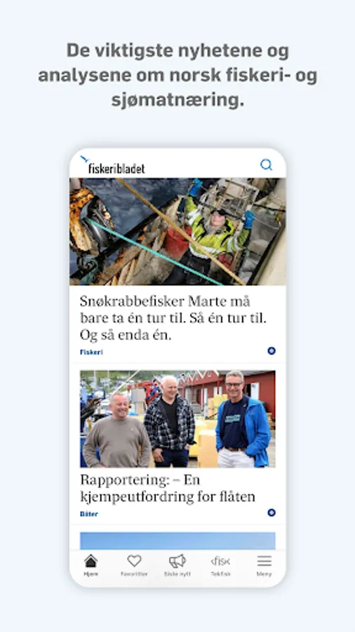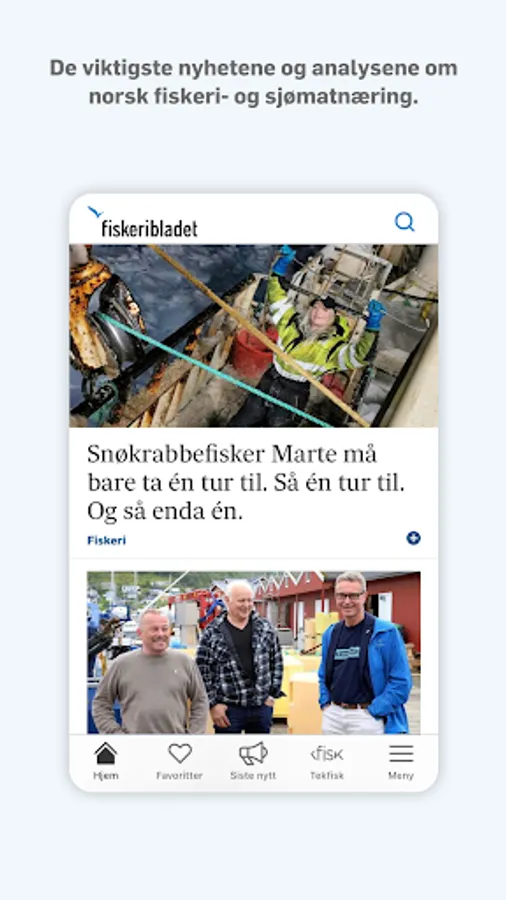 Get the most important news and analyzes about the Norwegian fisheries and seafood industry from Fiskeribladet directly to your mobile. Our new news app gives you a better reading experience than any other digital platform. Fiskeribladet is a subscription product, but you can register as a free user via the app.• Subscribe and get customized push notifications so that you get the news first when something happens in the industry - or when something happens in the market. • Get daily or weekly alerts about what interests you the most.• Keep up to date with the latest articles from your favorite journalists.