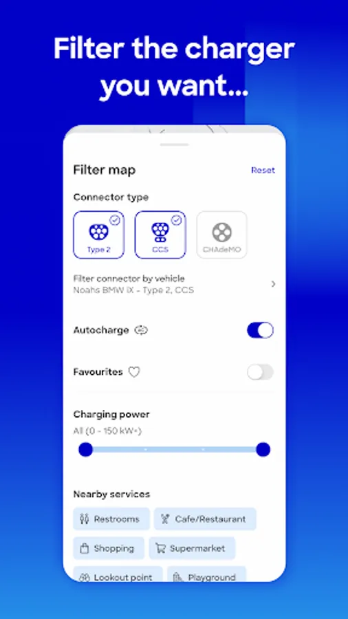The app provides you with a clear map of all Mer Norway and Mer Sweden’s chargers. In this map, you’re able to filter manually to present your desired chargers based on plug type or effect, or make this automatic, by adding your vehicle information. The app will then suggest charging stations based on this information.