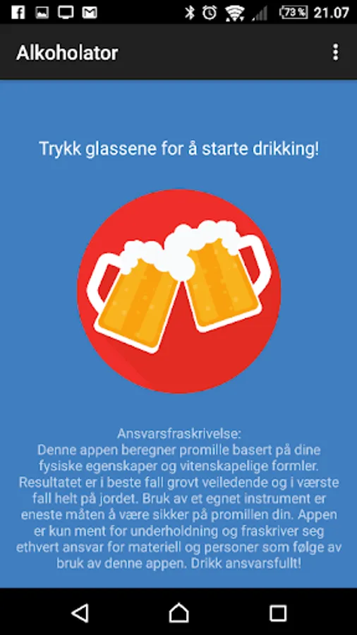 Computes thousandth your basis of how much you've been drinking. Keeps track of time and counting down to when you're sober. The app uses formulas from Public Health to calculate blood alcohol based on gender and body weight and replaces never a puff test. It will be rough guideline for how much drink you have.