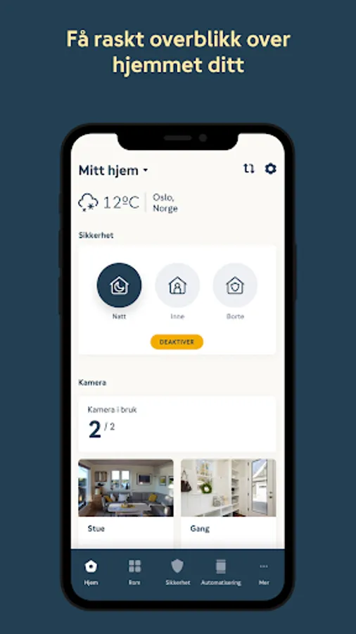 Boligblikk gives you a quick and easy overview of the home on the home screen. Here you can turn the safety function on and off and check the camera that everything is in order. If something important happens at home, you will be notified. You can choose whether you only want to be notified in the app or whether you want SMS and / or E-mail notification. The system also allows more people in the family to access, and you can easily manage user roles.
