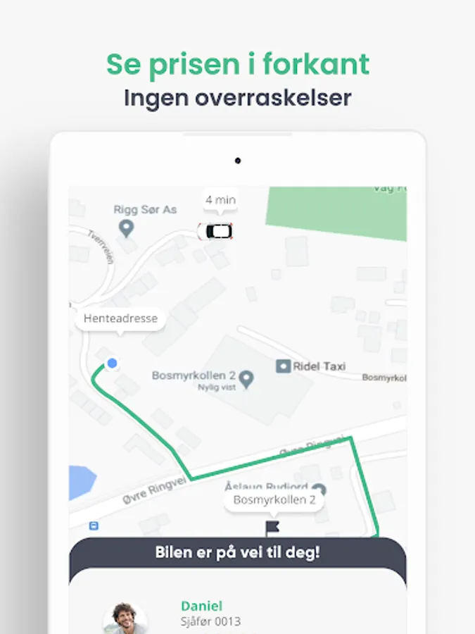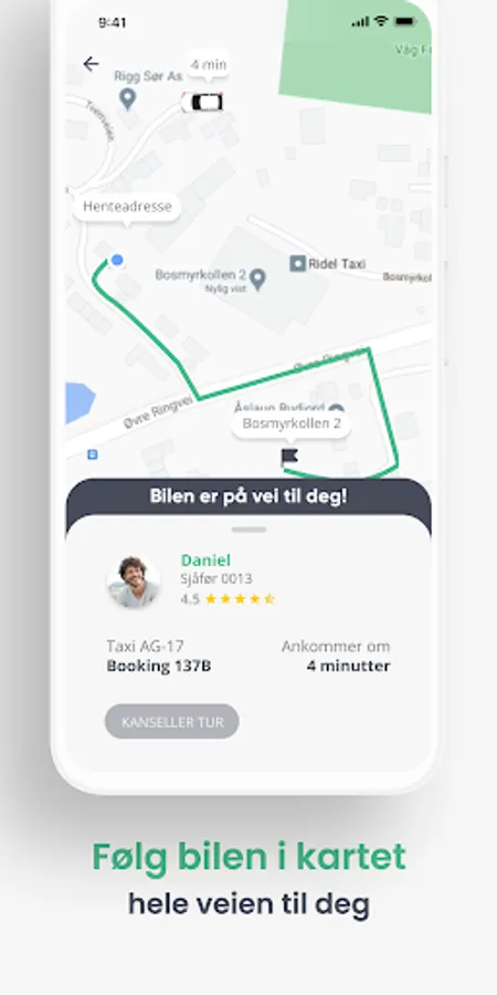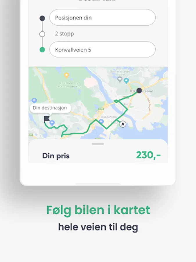 On the map you can follow the car's position all the way to where you are, and so on all the way to your destination. When you arrive, the amount is automatically deducted from your registered card or Vipps account and you will receive your receipt.