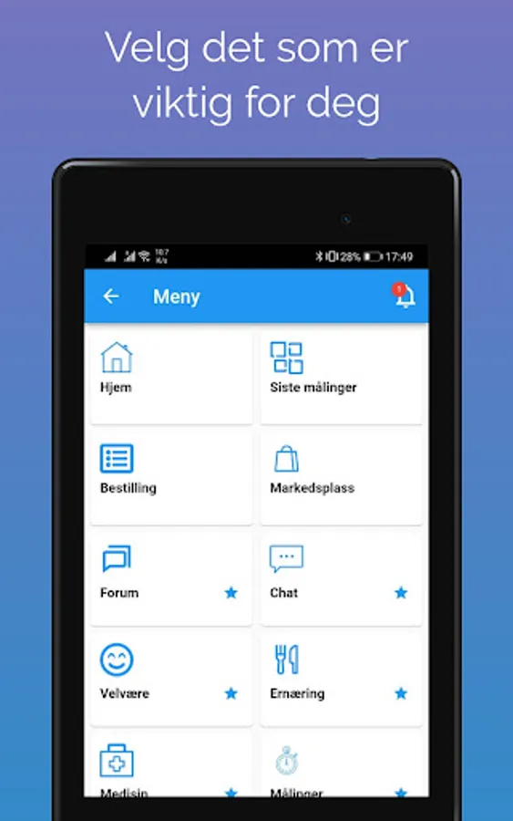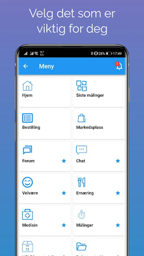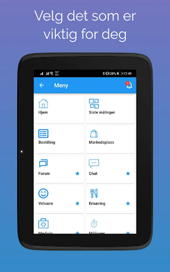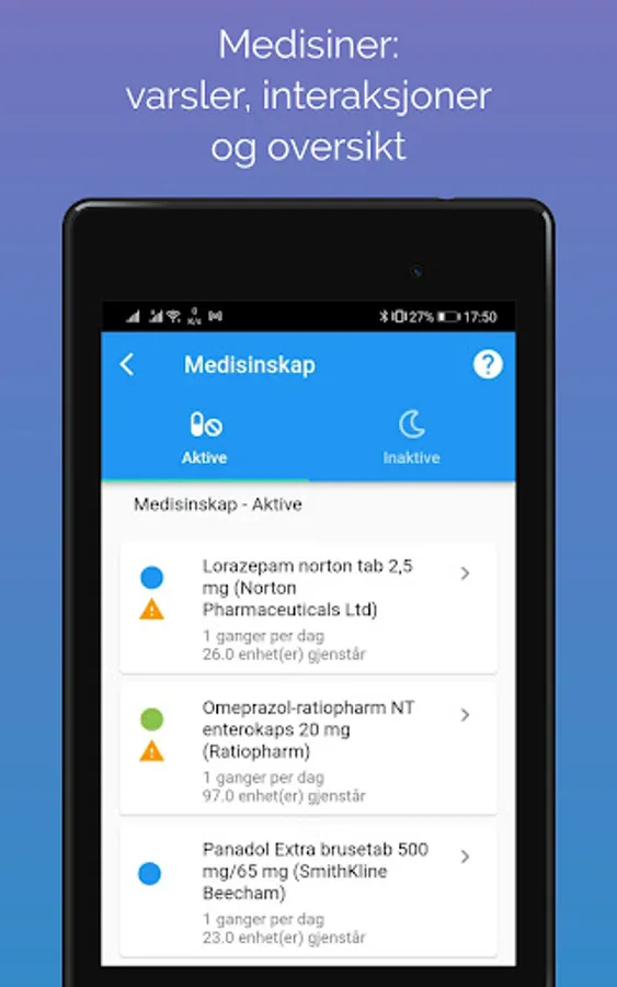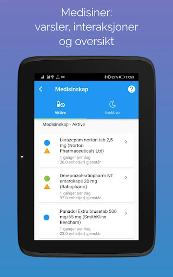 • MEDISINERING: Du får varsler når du skal ta dine medisiner. Du vil kunne registrere alle legemidler og lese pasientens informasjonsbrosjyrer på en veldig enkel måte fordi alle medisiner er forhåndsdefinert i henhold til Legemiddelverkets offisielle legemiddelregister. Du vil kunne utvikle en god rutine for medisininntak og dermed sørge for at du tar medisinene riktig. Det vil forbedre behandlingsresultatet.