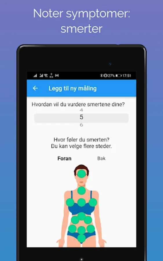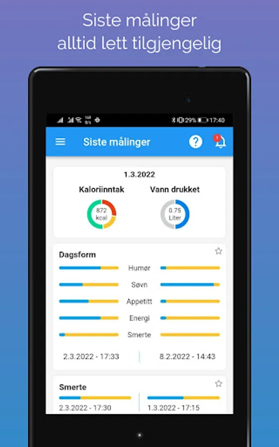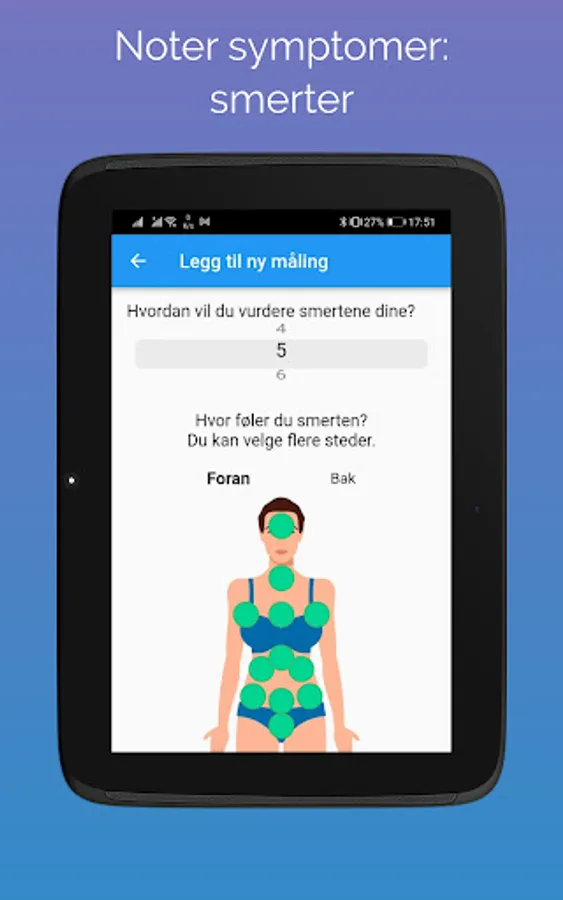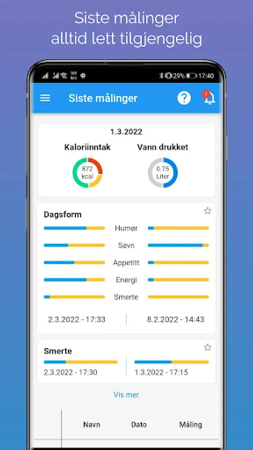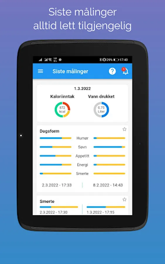 • FLERE MÅLINGER: Smerter, blodtrykk, puls, blodsukker, triglyserides, LHL, HDL, total kolesterol, oksygenmetning, seksuell aktivitet, avføring, urin, midjemål, spotting/blødning (3 helt gratis og maks 5 på de andre).