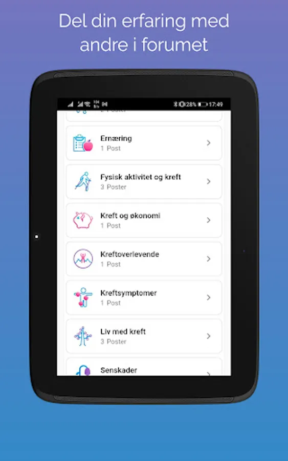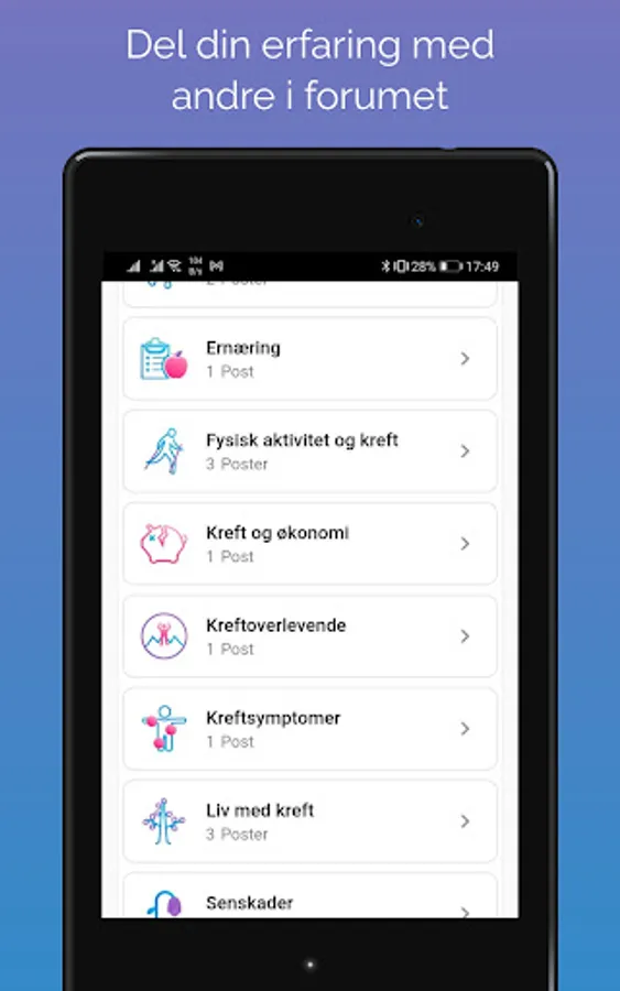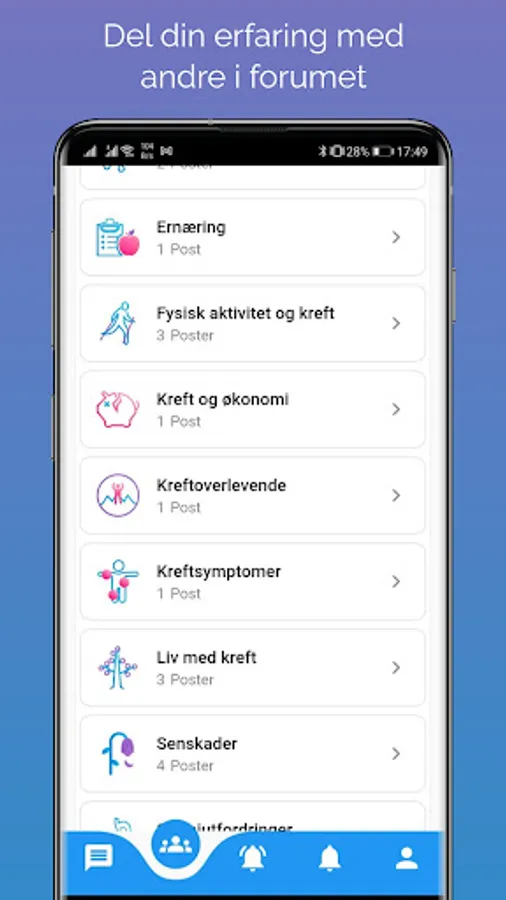 • FORUM: Bruk forumet for å finne og dele informasjon om sykdom, behandling og rehabilitering.